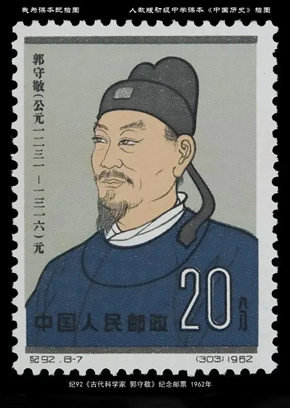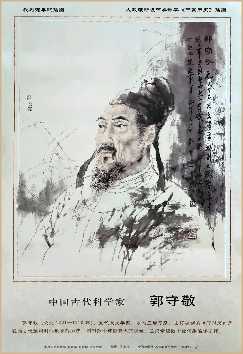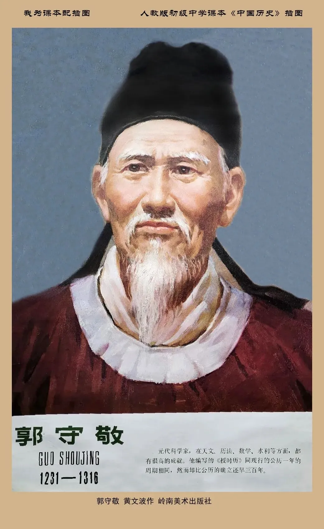 郭守敬(1231年—1316年)是元朝杰出的科学家。他在天文,历法,数学,水利等方面,都有很高的成就。元世祖时候,郭守敬负责修订历法。他制造了十多种天文仪器,对天象进行实际的观测和精密的推算。他算出一年有365.2425天,同地球绕太阳一周的实际时间相比,只差26秒。他编成一部新的历法《授时历》,同现行的公历一年周期相同。《授时历》比现行公历的确立还早三百年。他还主持全国范围的天文测量工作,最北的观测点是北海,在今西伯利亚。最南的观测点是南海,就在今天的西沙群岛上。