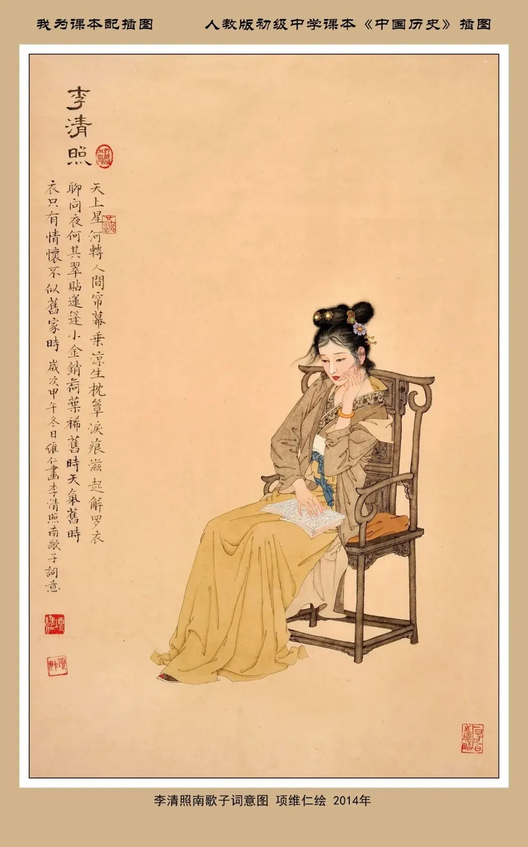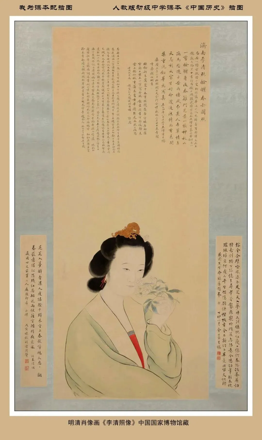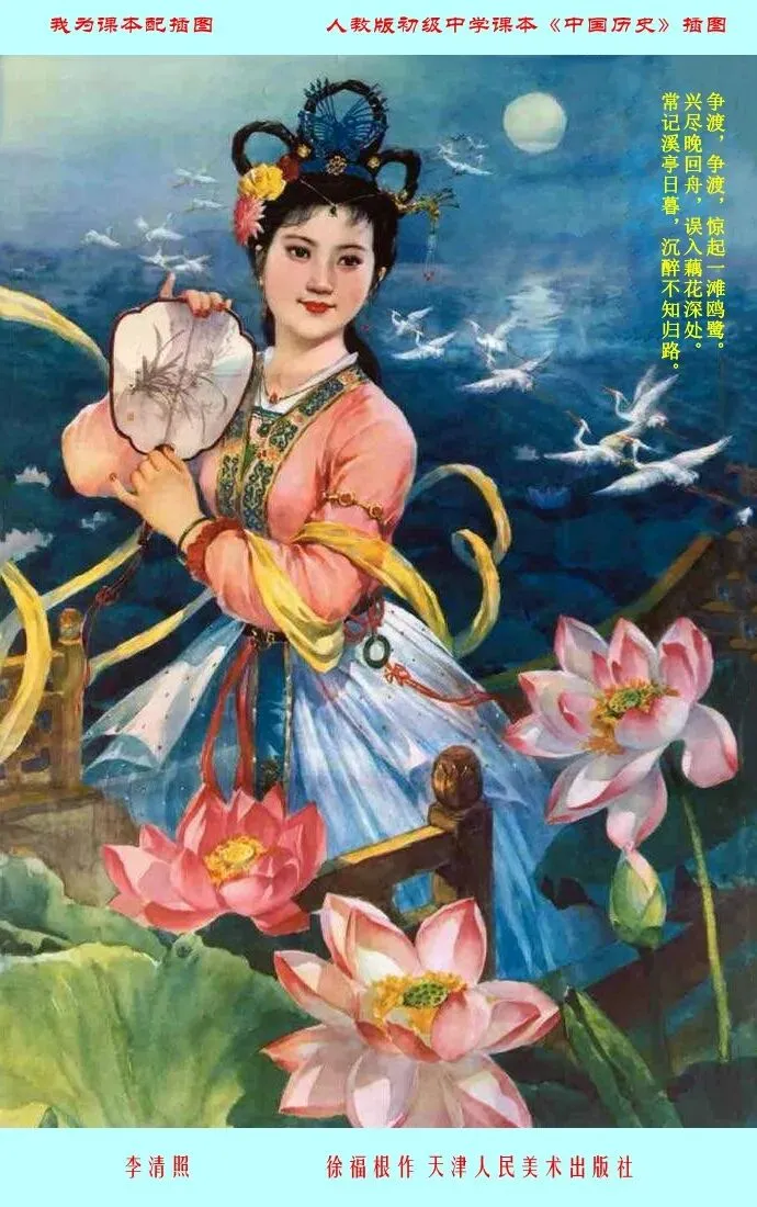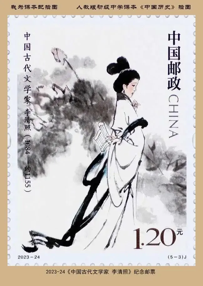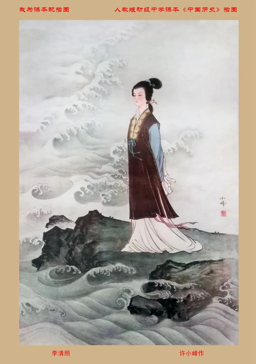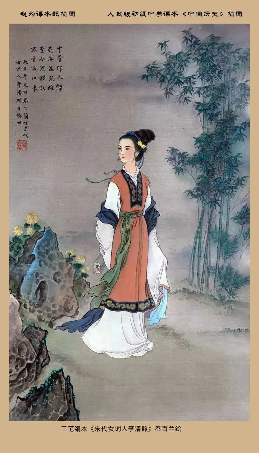 李清照(1084年一约1151年)是南宋杰出的女词人。她的词委婉清新,感情真挚。前期的词,充满了生活气息。在一首词里,她描写一个天真活泼的小姑娘见到生人来的情景:"和羞走,倚门回首,却把青梅嗅。"中年以后,金军南下,她流亡到南方,作品渗透了忧伤的感情。她还擅长写诗,内容较多地反映了忧国思想。象传世的名句:"生当作人杰,死亦为鬼雄",就写得慷慨,雄劲,悲壮。