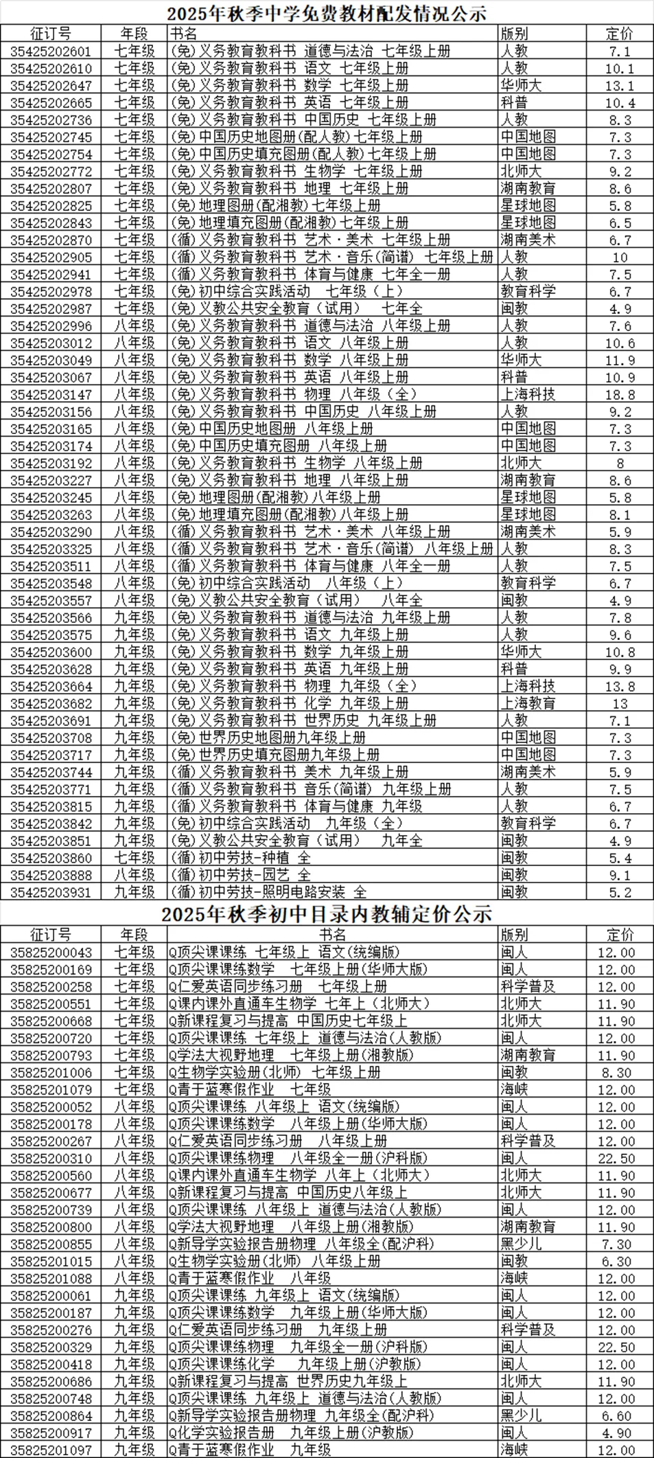 >晋江市三民中学2025年秋季初中教材教辅征订目录公示