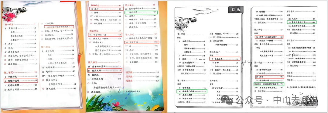 删掉课文:10.《沙滩上的童话》 11.《我是一只小虫子》 23.《祖先的摇篮》