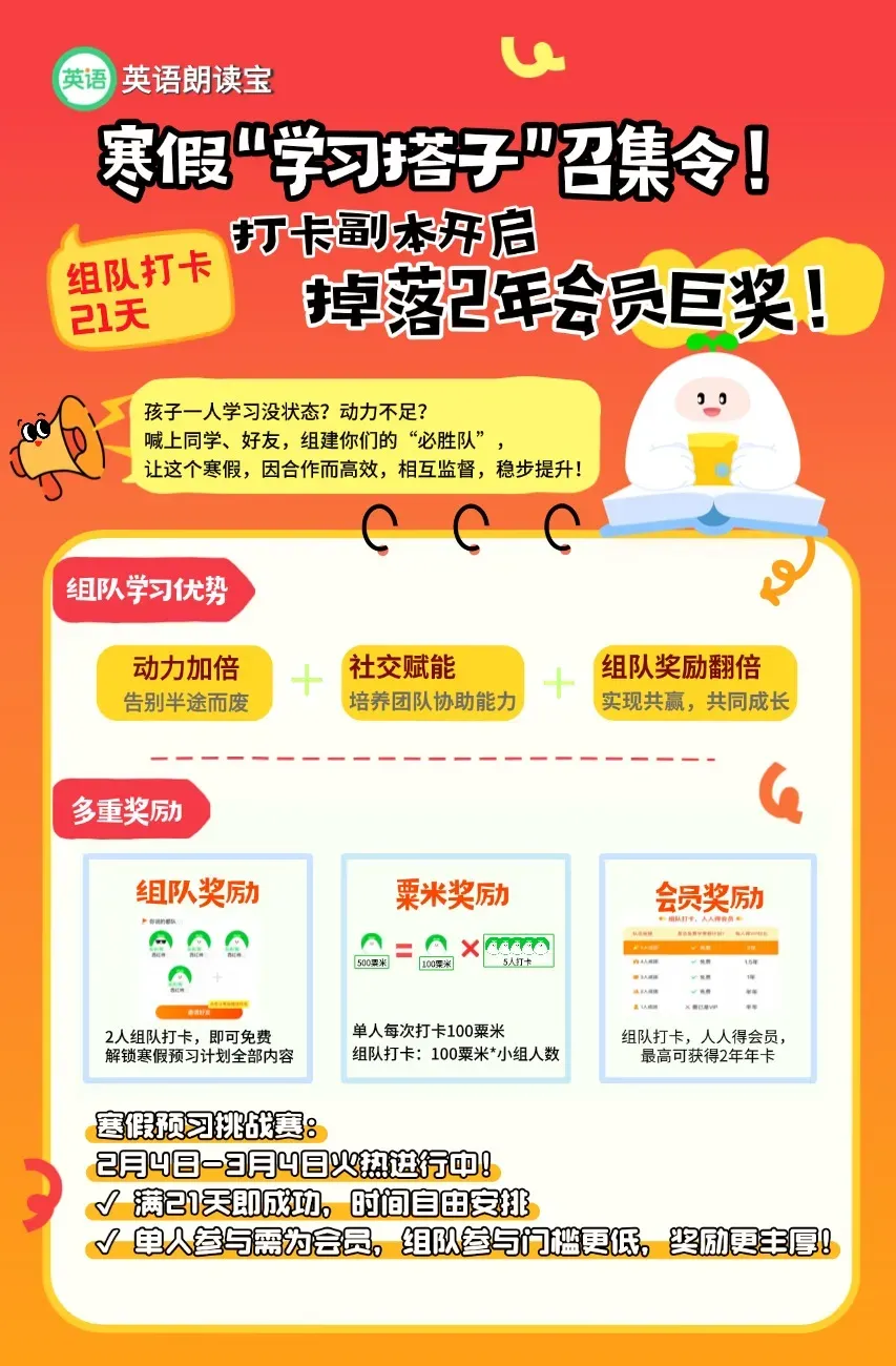 现在孩子邀请好友或同学,2人组队即可免费解锁【寒假预习计划】全部内容,只要组队打卡21天!即可获得英语朗读宝会员!组队人越多,奖励越多,最高可得2年年卡!