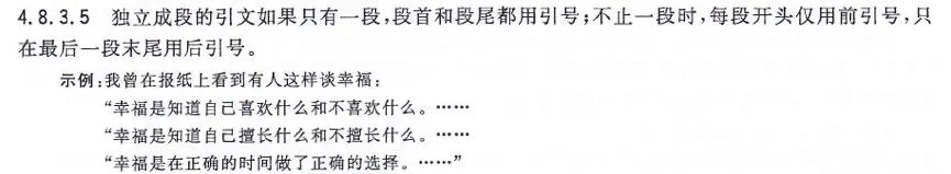 答:关于引号的用法,有这样的规定:“独立成段的引文如果只有一段,段首和段尾都用引号;不止一段时,每段开头仅用前引号,只在最后一段末尾用后引号。”这一规定出自中国国家标准化管理委员会2011年12月30日发布的《标点符号用法》(GB/T 15834-2011),如下: