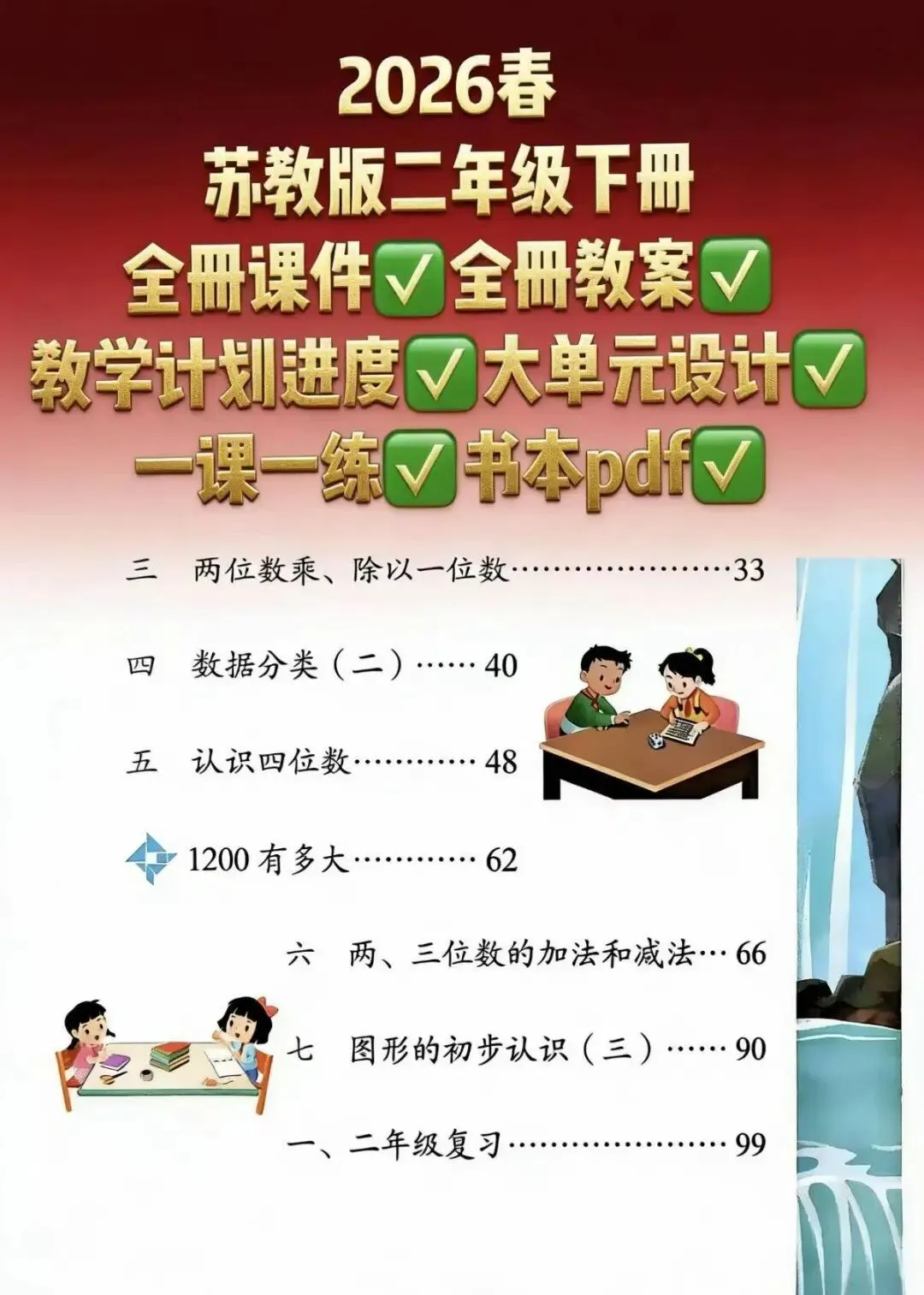 大家好我是白菜学库;今天跟大家分享的是;2026苏教版小学二年级下册数学(教材解读课件+(核心素养)大单元教案+单元测试+教学计划)提供电子版,支持打印和下载。