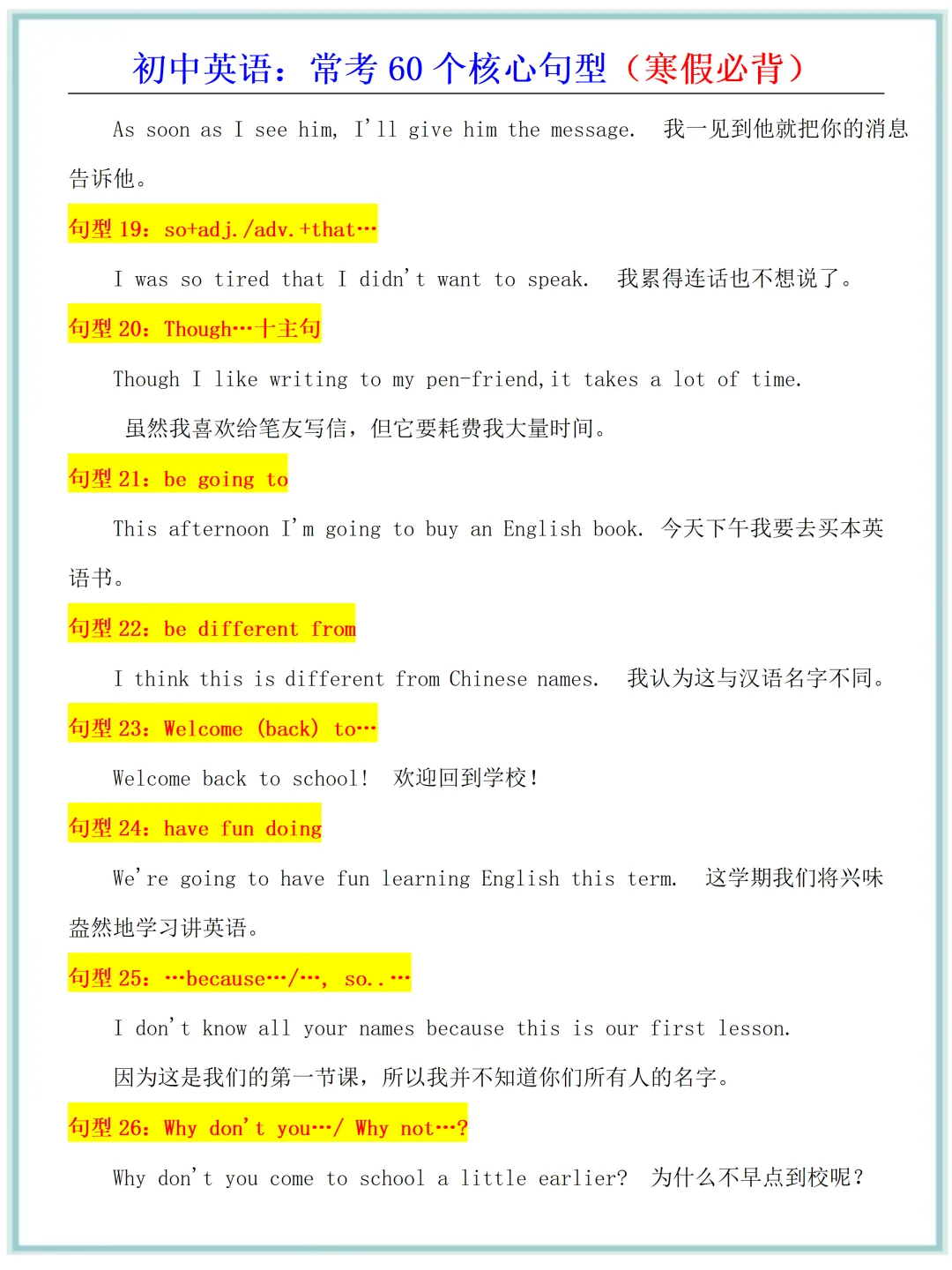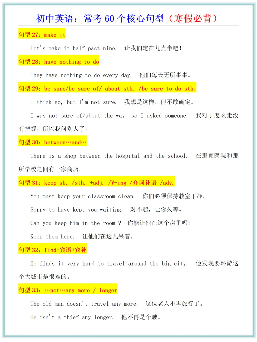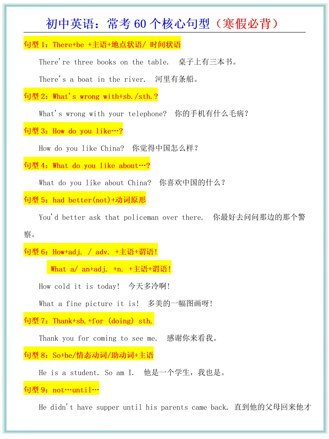 新版教材2026年春初中英语·常考60个核心句型(寒假必背),电子版可打印!