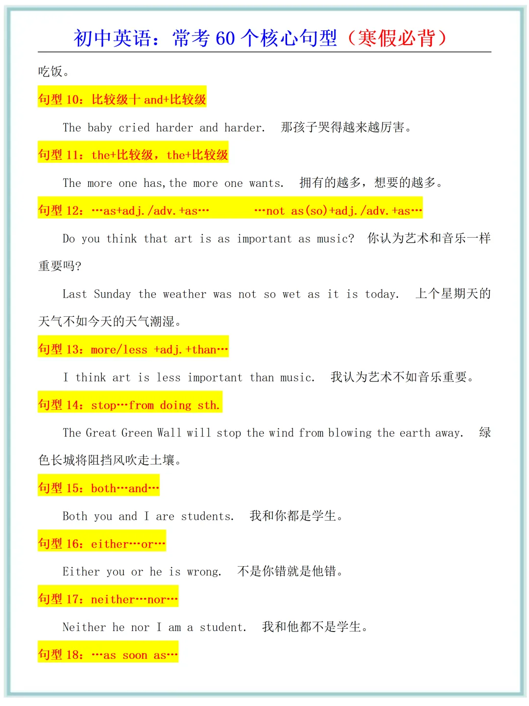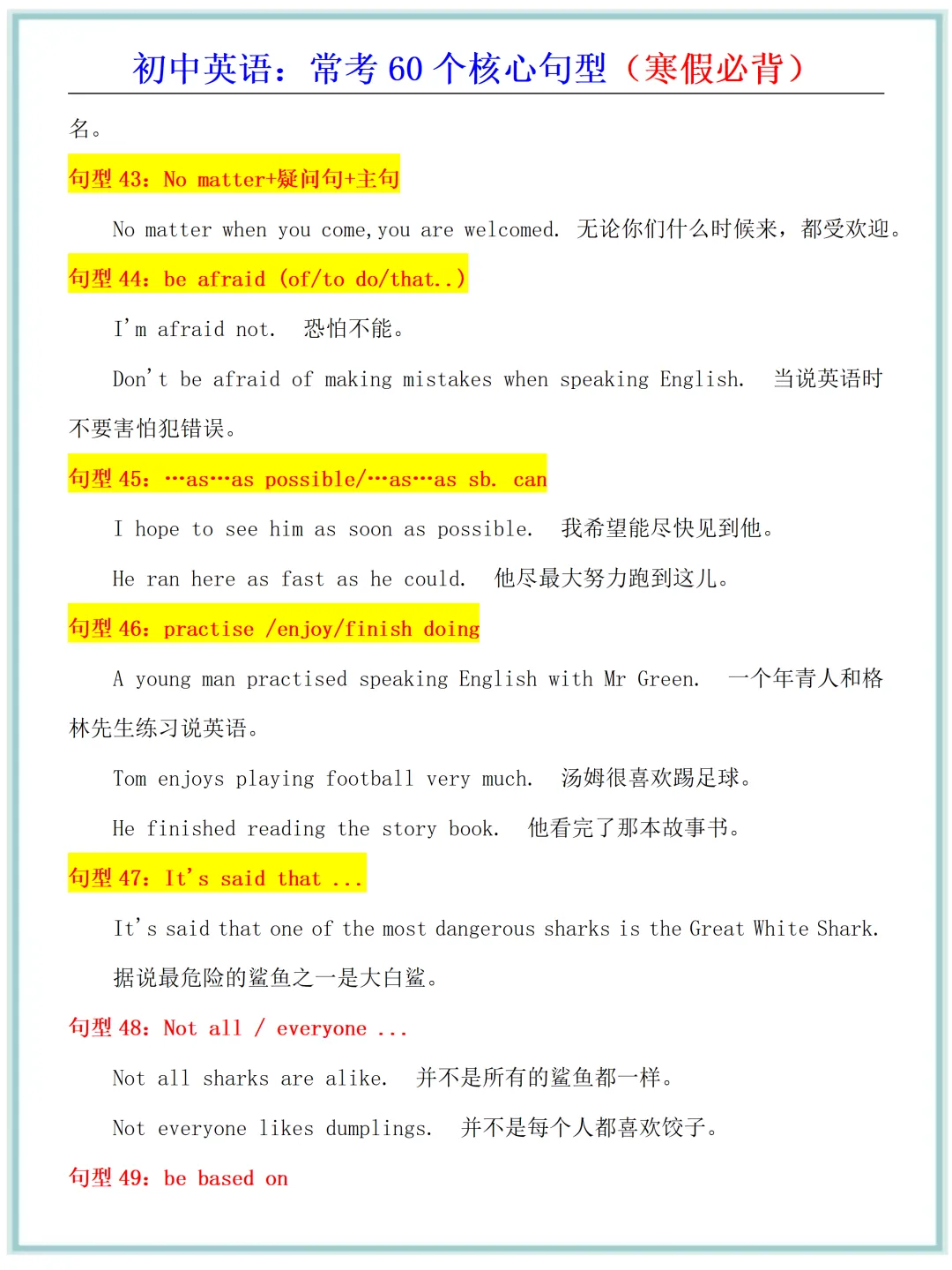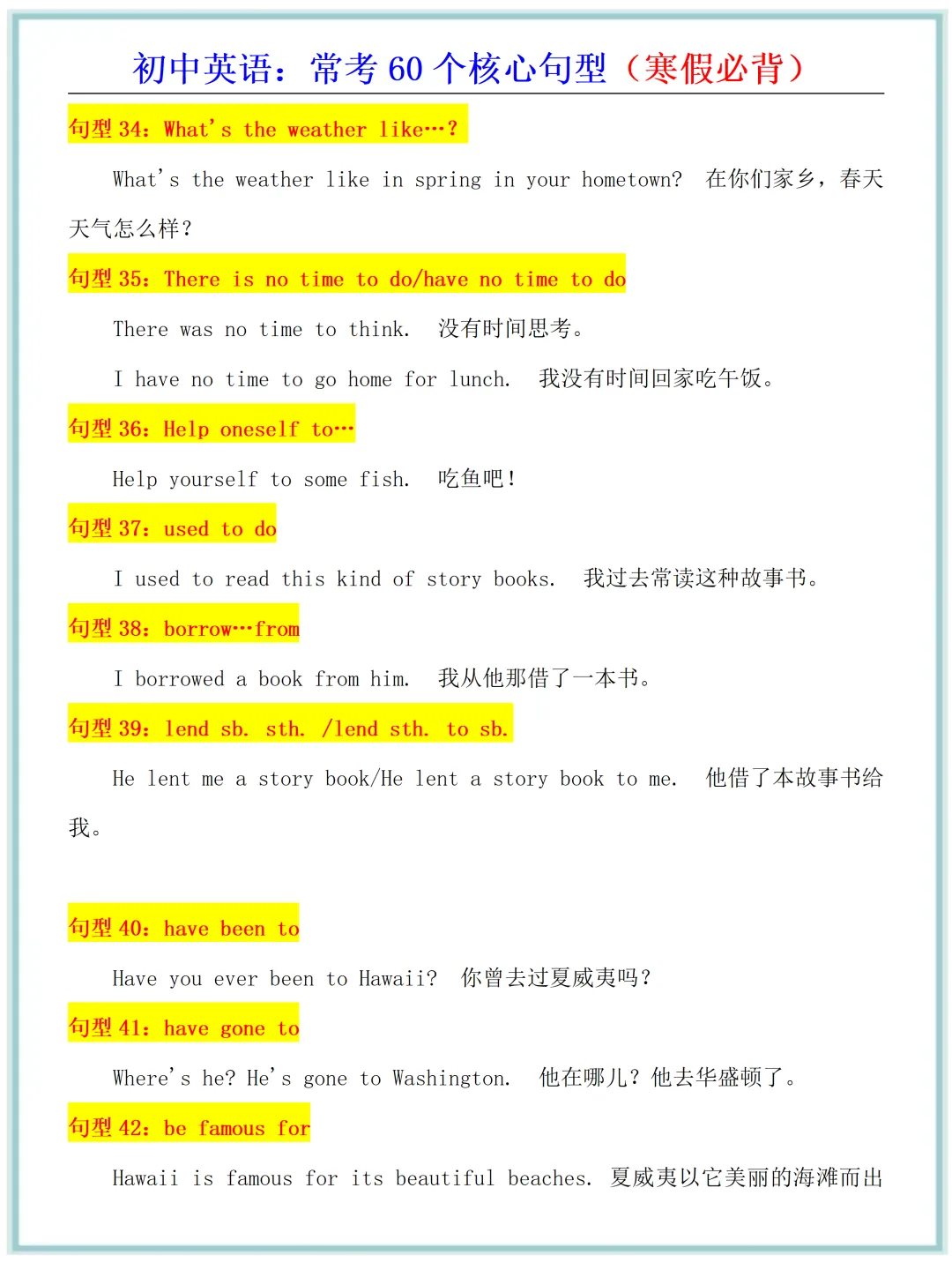 新版教材2026年春初中英语·常考60个核心句型(寒假必背),电子版可打印!