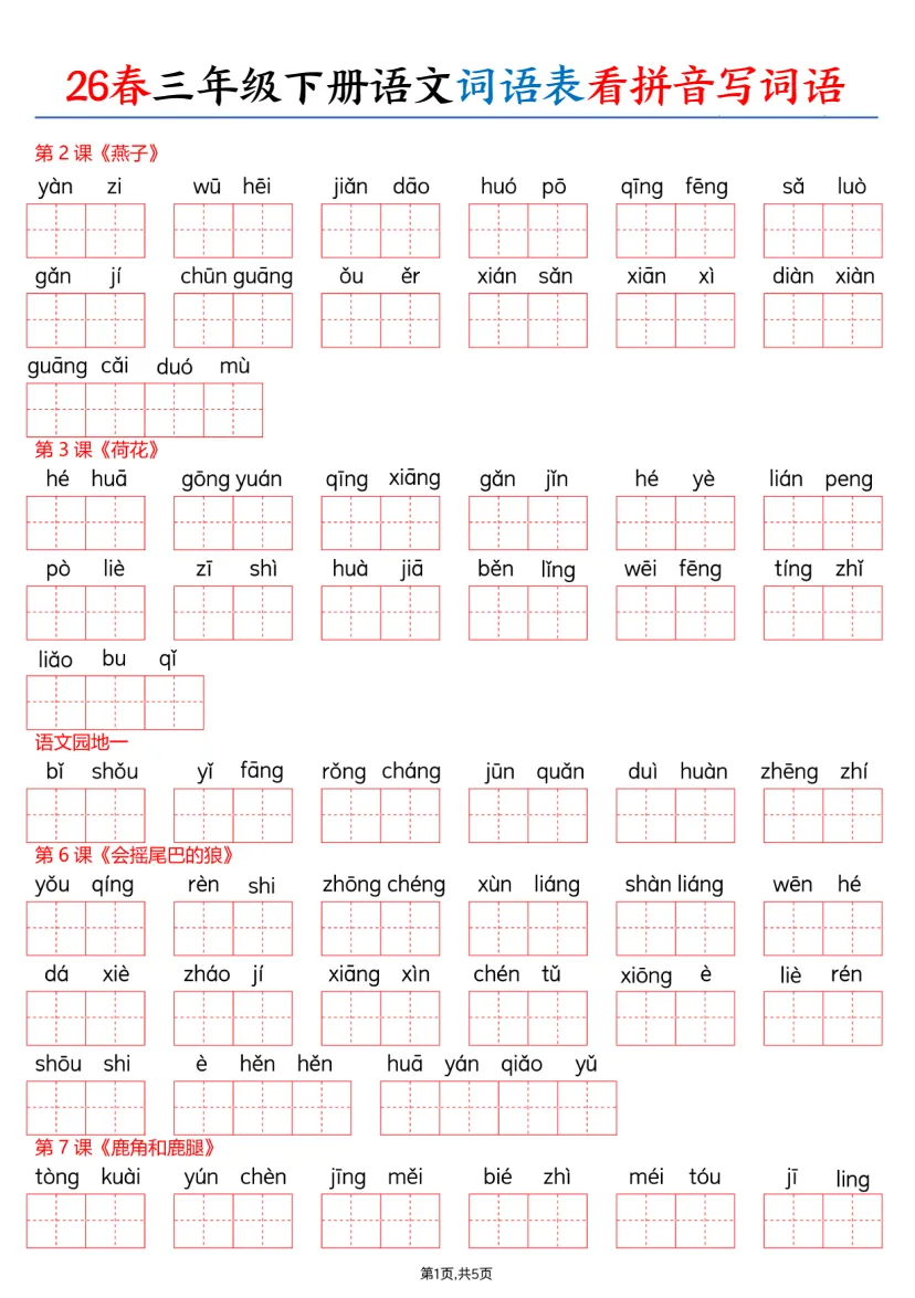 同步教材!2026春季最新版小学语文《课后三表》1-6年级专项练习PDF,可下载打印,巩固课内字词必备
