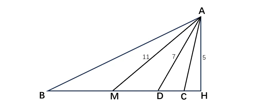 在群友 @小米百合 的公众号 @数形直通车 看到一道几何题,据说是名叫Omid Motahed的数学家提供的,好奇心使然,随手一搜,只找到下面这位,更像是个程序员转行的数学教师,罢了,姑且存疑。如图所示,三角形ABC是钝角三角形,∠C为钝角,中线AM = 11,角平分线AD = 7,高线AH = 5,求三角形ABC的面积。