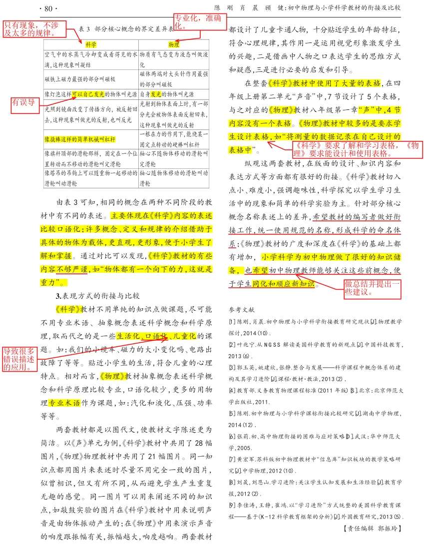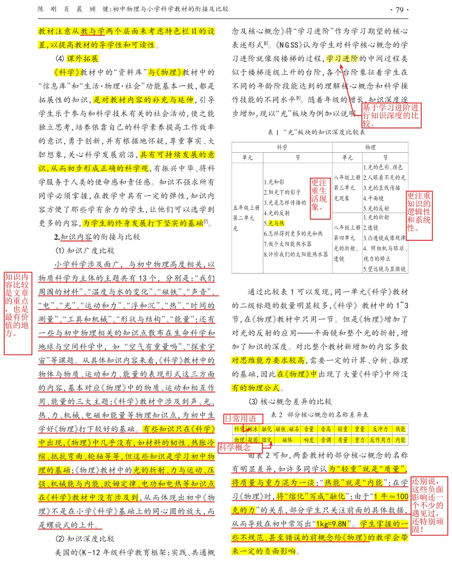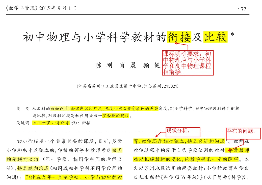 今天学习的论文题为“初中物理与小学科学教材的衔接及比较”,该文发表于《教学与管理》2015年9月。文章虽然是十年前,但是,所选取的“学段衔接与教材比较”是教师较少关注的点。以前的小学,基本没有开设科学课,即使开设也没有认真上过,只是到期末的时候,就发两张卷子(有的答案就附在上面)让学生背,应付一下考试,考试完也就全忘了。所以,学生上初中,除了生活常识外,对物理还是一片空白,老师都是从零教起。随着时代发展,近两年,国家越来越重视科学教育,尤其是小学科学,每所学校都要求配备专业的科学老师,让现在小学生享受正规的科学启蒙教育。另外,现在的互联网发达,学生通过网络也能够了解一些科学常识。所以,现在的学生和以前相比,一定是带有部分较浅显的科学认识进入初中物理课堂,需要老师通过科学手段探明白,不能再依靠先前的教学经验了。如何了解学生的已有认识?除了做问卷调研之外,一个很好的办法就是对小学科学和初中物理的教材进行比较,因此,这篇文章还是很有现实意义的。当然,如果有老师想模仿着进行文章写作,光看这篇文章是不够的。因为十年前的文章能发表在《教学与管理》这样高水平的期刊,十年后的今天,可能要求要高很多。所以,若想写小学与初中、初中与高中、新旧教材、不同版本教材等的对比分析,需要下载近三年的文章学习才行。