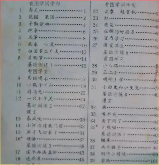 看着这页目录,《春天》,《降落.伞》,《司马光》…….每一个标题后面,都藏着一节45分钟的课,藏着老.师粉笔灰的味道,藏着同桌悄悄递过来的半块橡皮。