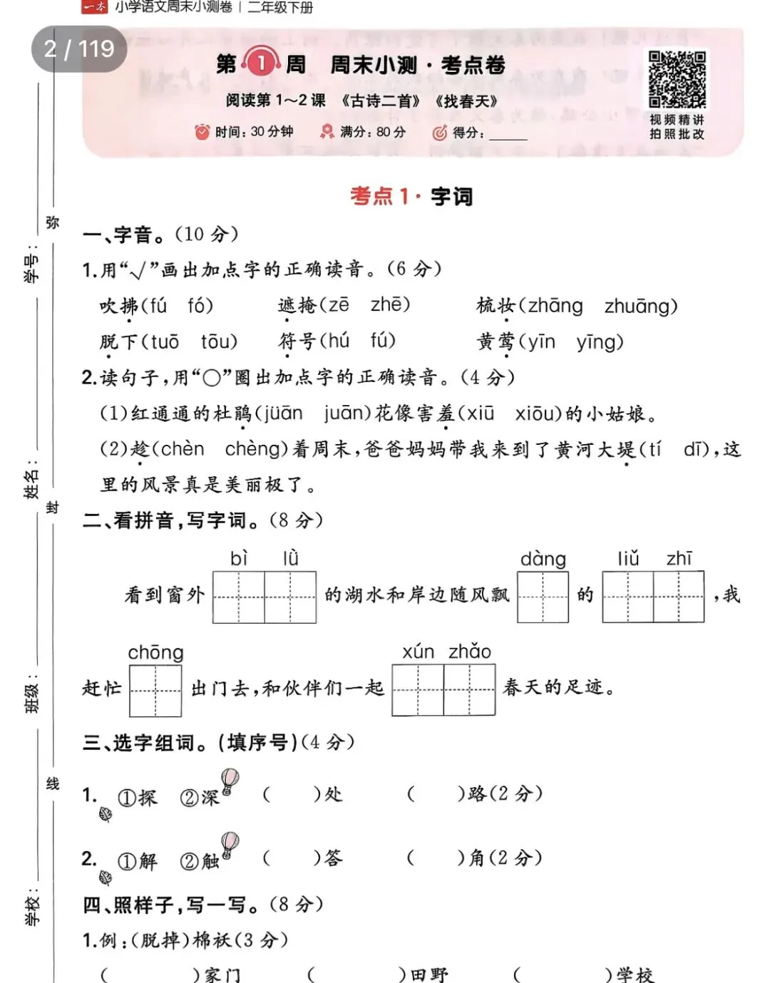 26春新教材小学语文二年级下册一本周末小测,课时练一课一练,寒假预习必备电子版可下载打印参考,喜欢的家长老师们可以打印出来给孩子练练手!查漏补缺!