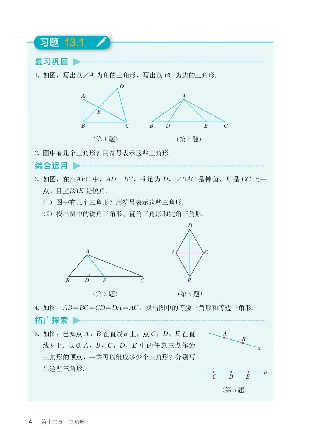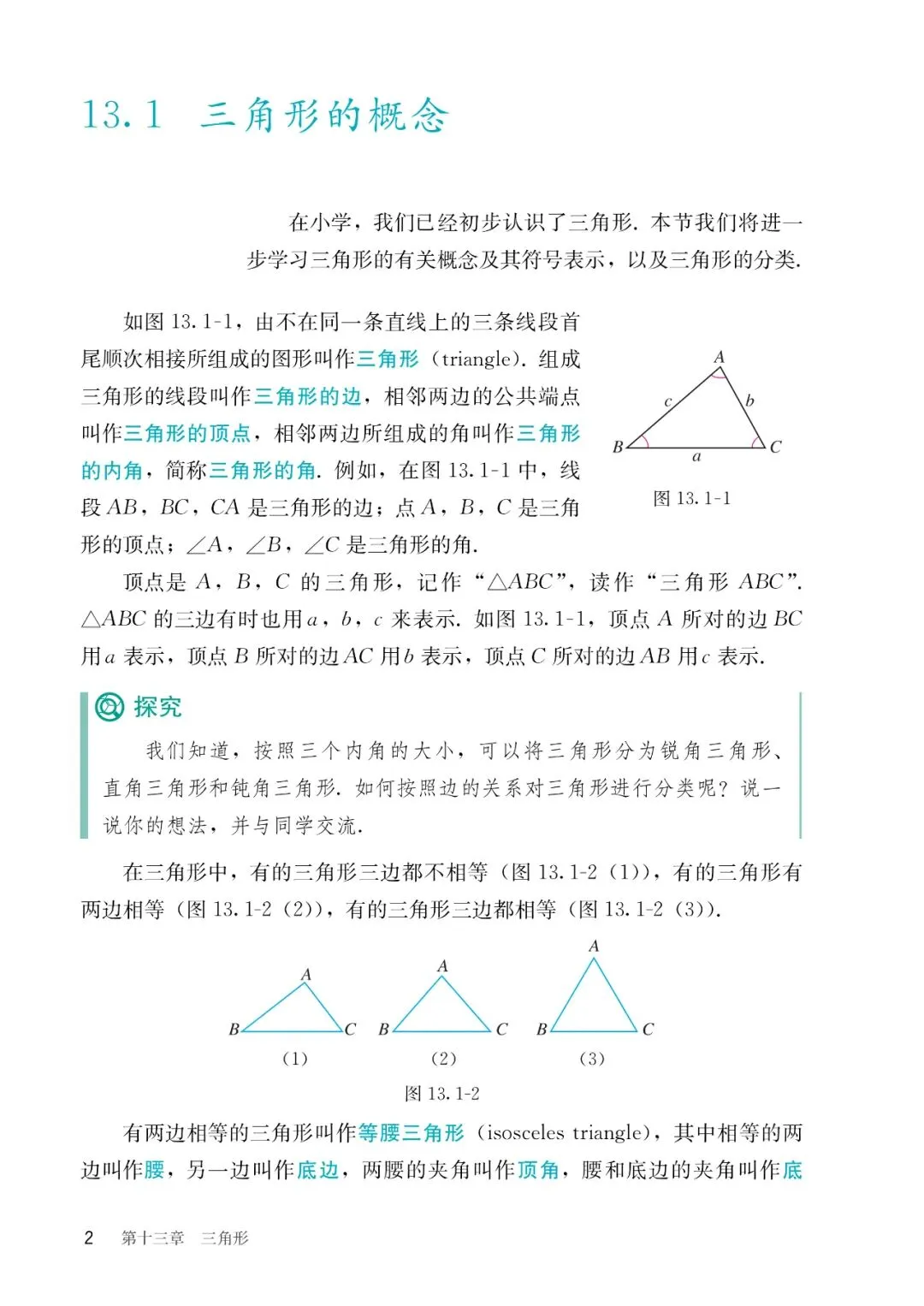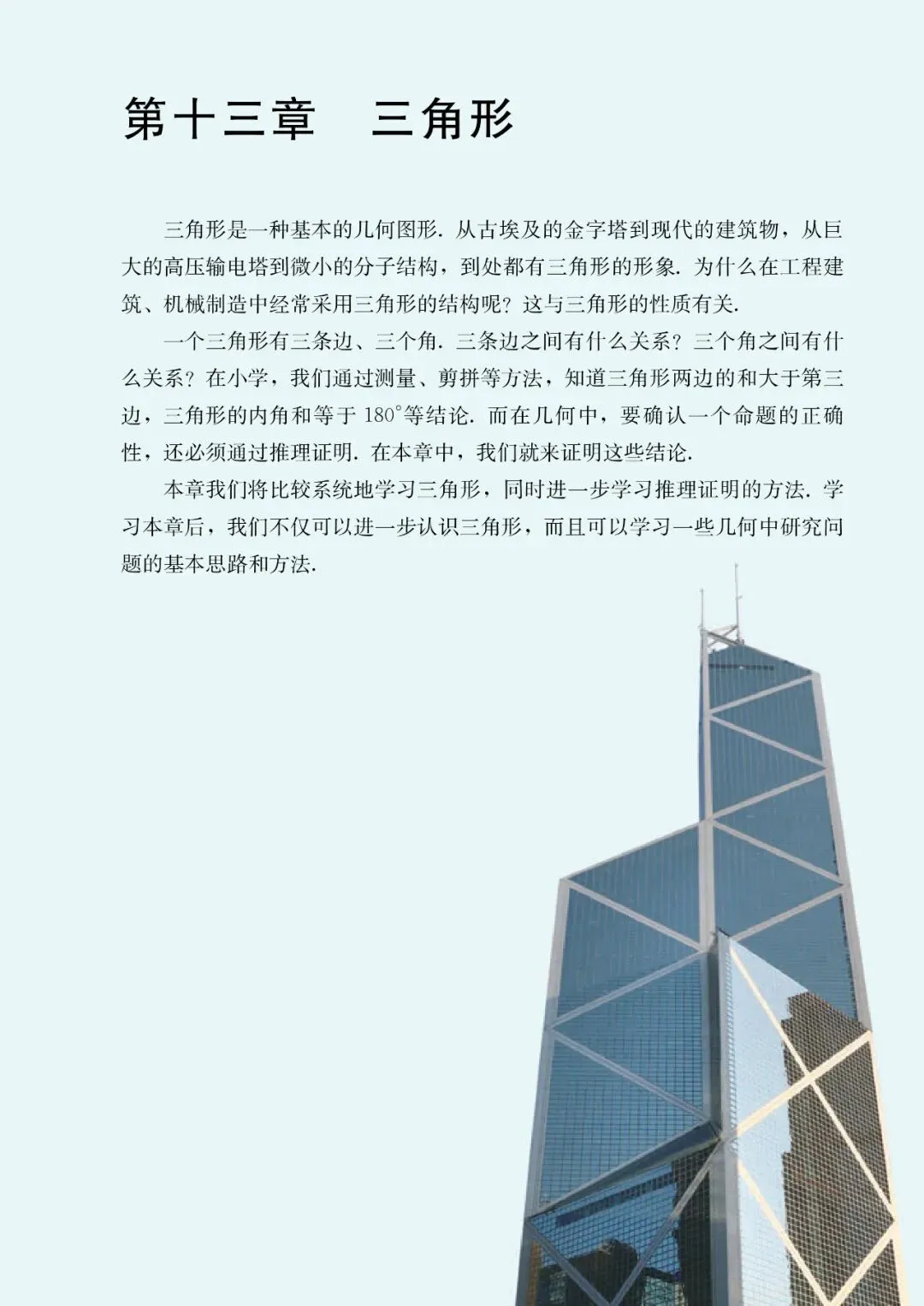 【1】第十三章 三角形:主要内容包含三角形的概念、三角形的分类、与三角形有关的线段(边、高、中线、角平分线)、三角形的内角和定理及外角性质、利用三角形确定匀质薄板的重心位置