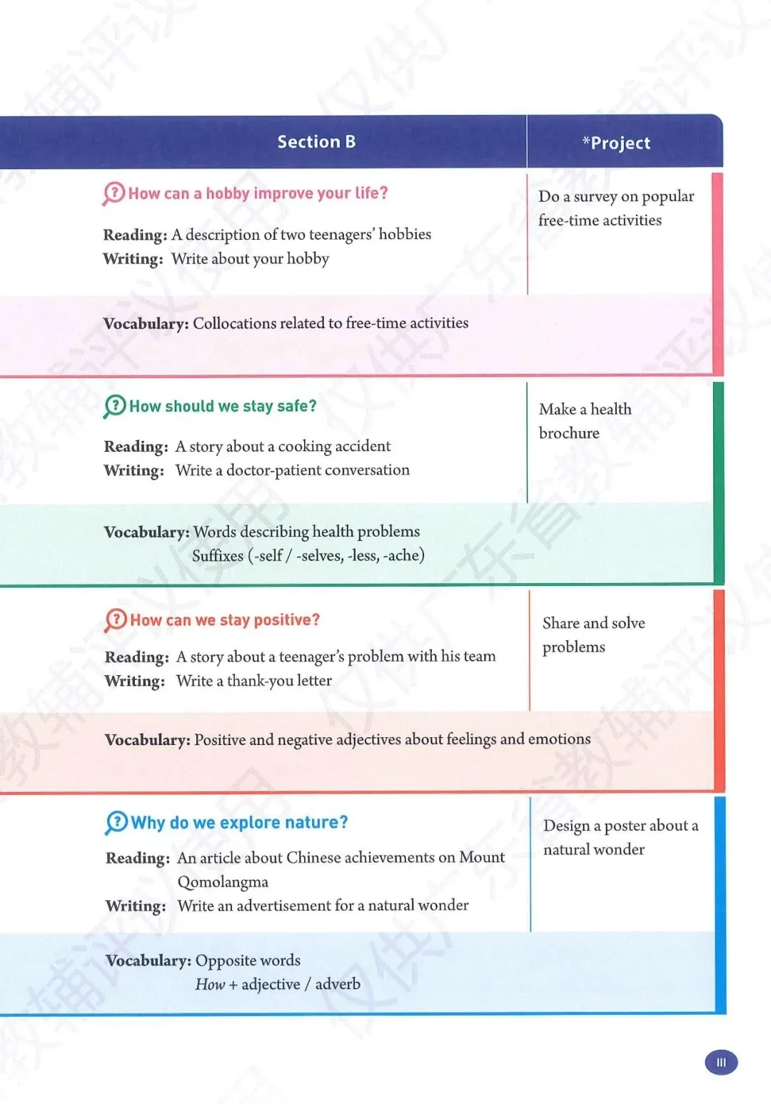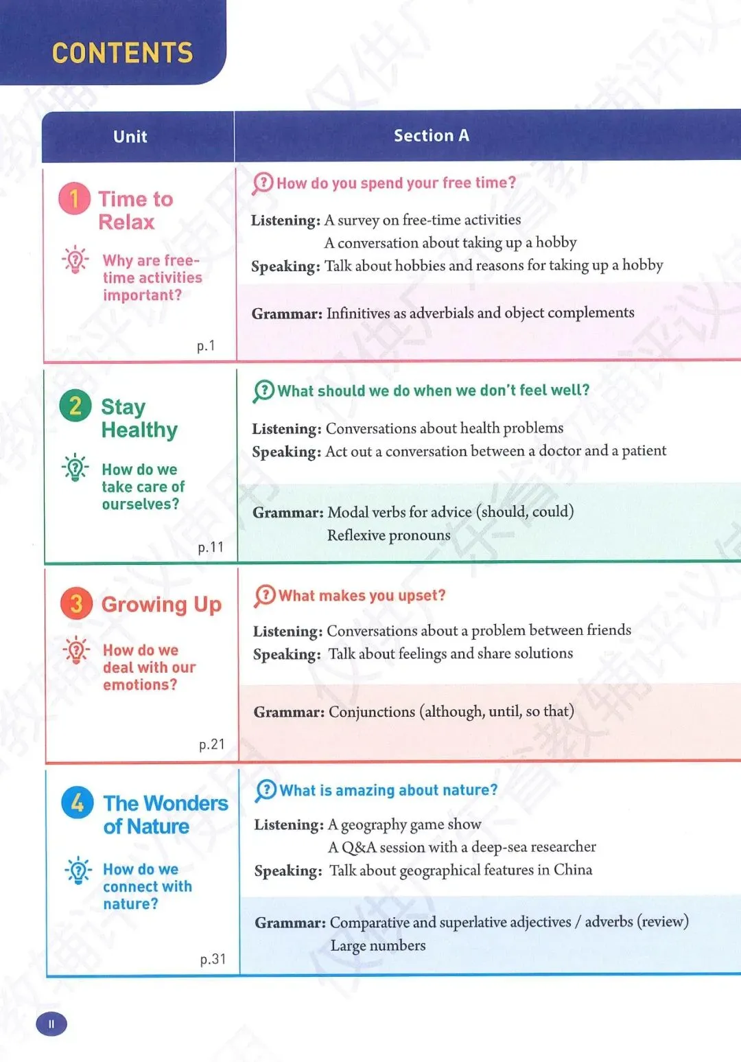 【1】Unit 1-2 健康建议与志愿服务:主要内容包含疾病与身体不适的表达、给出合理的建议(Should)、志愿活动与帮助他人的词组及语篇表达。