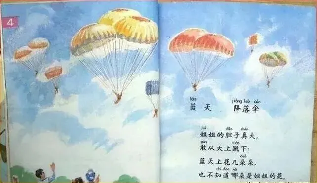 看着图.上这简单的水彩画,那时候觉得这简直就是世界上.最美的.画作。那时候的我们,看着课本里的降.落伞,.脑子里幻想的.都是自己也能飞上蓝天。虽然那时候连飞机都没见.过,但课本给了我.们无穷的.想象力。