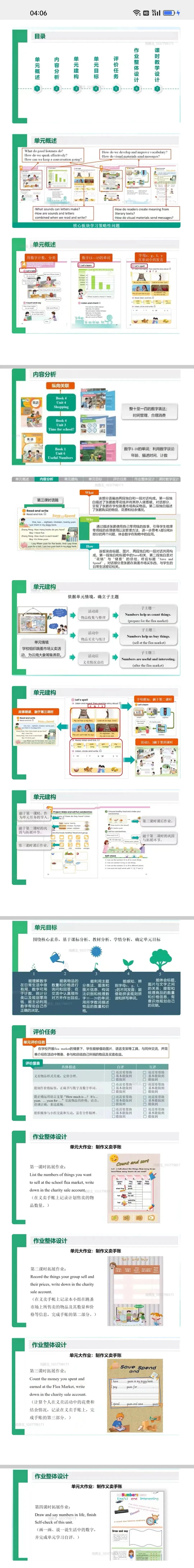 单元目标:围绕核心素养制定,包括理解数字的用途、能询问回答数量和价格、感知字母发音、借助图表梳理信息、有意识规划花销等。