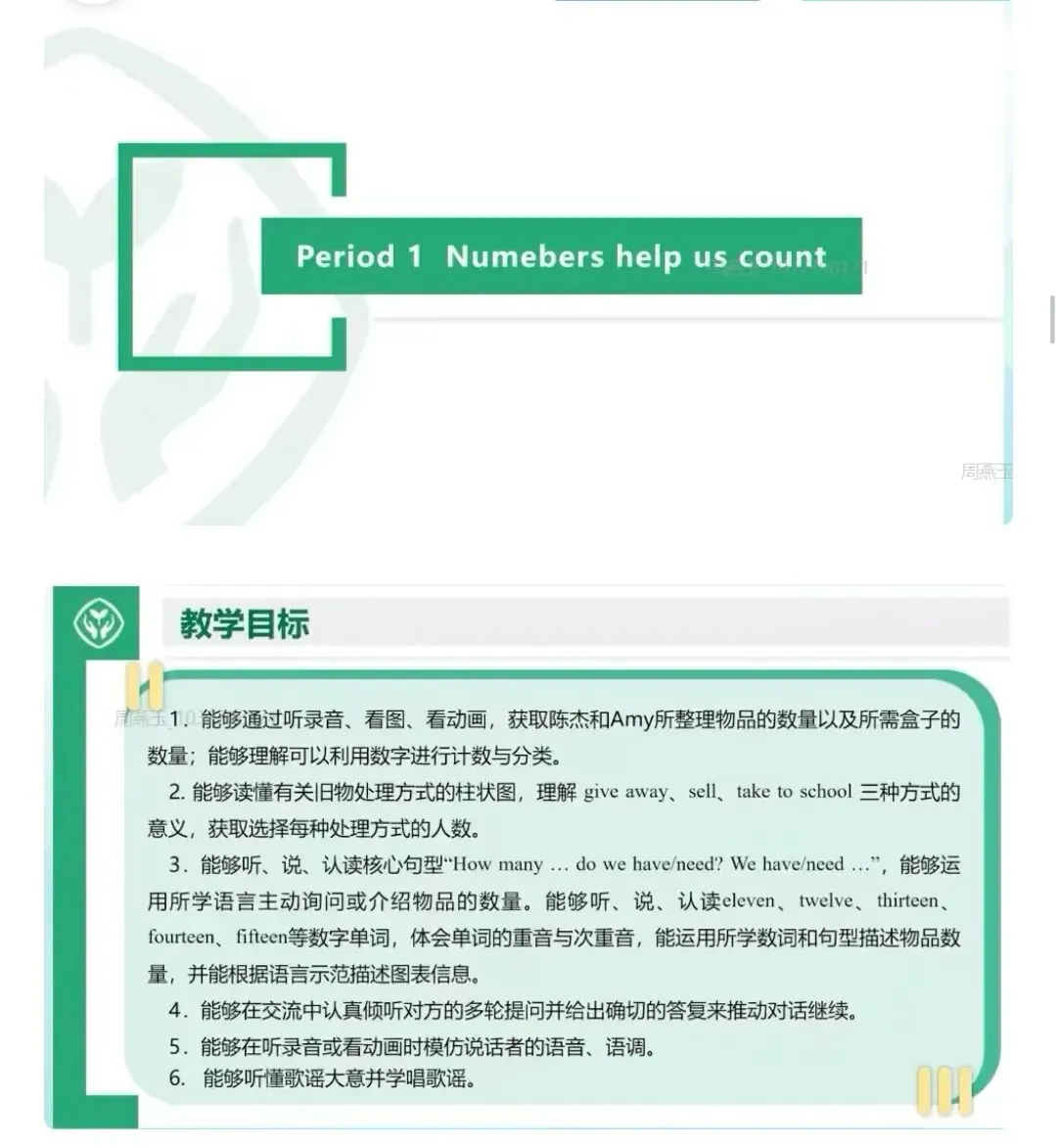 Period 1: Numbers help us count (数字帮助我们计数):聚焦物品分类、计数,学习句型“How many... do we have/need?”。