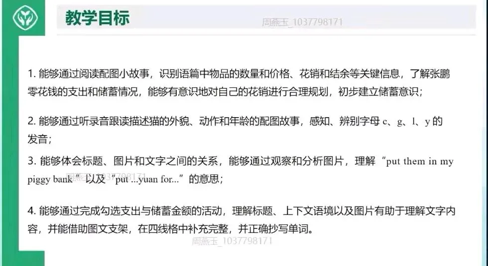 Period 3: Save and spend (储蓄与花费):通过阅读张鹏的零花钱故事,理解收支概念,培养合理规划意识,同时学习语音。