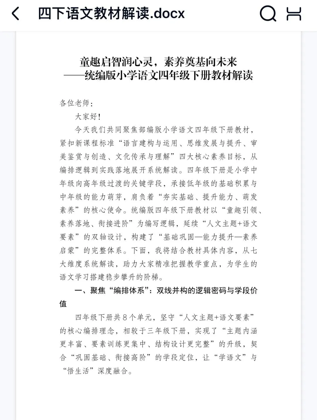 今天我们共同聚焦部编版小学语文四年级下册教材,紧扣新课程标准“语言建构与运用、思维发展与提升、审美鉴赏与创造、文化传承与理解” 四大核心素养目标,从编排逻辑到实践落地展开系统解读。四年级下册是小学中年级向高年级过渡的关键学段,承接低年级的基础积累与中年级的能力萌芽,肩负着“夯实基础、提升能力、萌发素养”的核心使命。统编版四年级下册教材以“童趣引领、素养落地、衔接进阶”为编写逻辑,延续“人文主题+语文要素”的双轴设计,构建了“基础巩固一能力提升一素养启蒙”的完整体系。下面,我将结合教材具体内容,从七大维度系统解读,助力大家精准把握教学重点,为学生的语文学习搭建稳步攀升的阶梯。