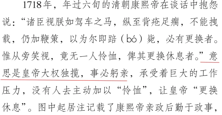 康熙这句话讲的是自己很辛苦,而诸臣却不为自己分忧,哪里有提及“皇帝大权独揽,事必躬亲”。