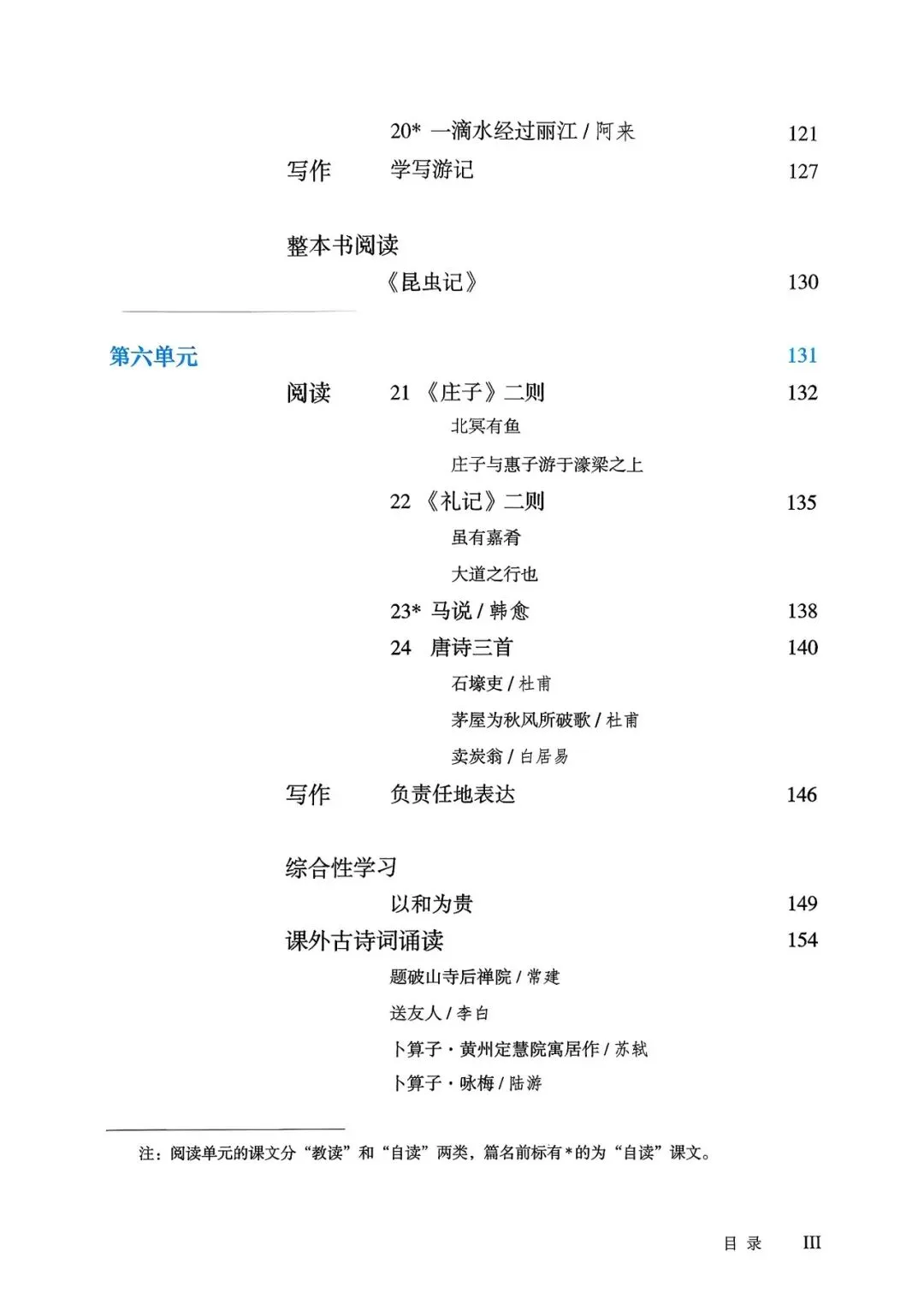【1】第一单元 民俗风情:主要内容包含地域文化与节日习俗鉴赏(《社戏》《回延安》)、富有表现力的语言捕捉、民俗文化中的情感寄托。 【2】第二单元 科学之光:主要内容包含科普说明文的逻辑与语言(《大自然的语言》《阿西莫夫短文两篇》)、说明顺序与说明方法的综合运用。 【3】第三单元 古诗苑漫步:主要内容包含山水名篇与世外桃源的意境(《桃花源记》《小石潭记》)、文言常用实词与虚词的积累、古人的情趣与志向。 【4】第四单元 活动演讲:主要内容包含演讲稿的撰写与表达技巧(《最后一次讲演》《应有格物致知精神》)、观点与材料的统一、论证的逻辑性。 【5】第五单元 游记大观:主要内容包含游记的写作路径与感悟(《壶口瀑布》《在长江源头各拉丹冬》)、写景的视角转换、情景交融的最高境界。 【6】第六单元 经典传承:主要内容包含古代名篇与诗词积累(《〈庄子〉二则》《礼记二则》)、理解古人的社会理想、背诵默写核心诗文。
