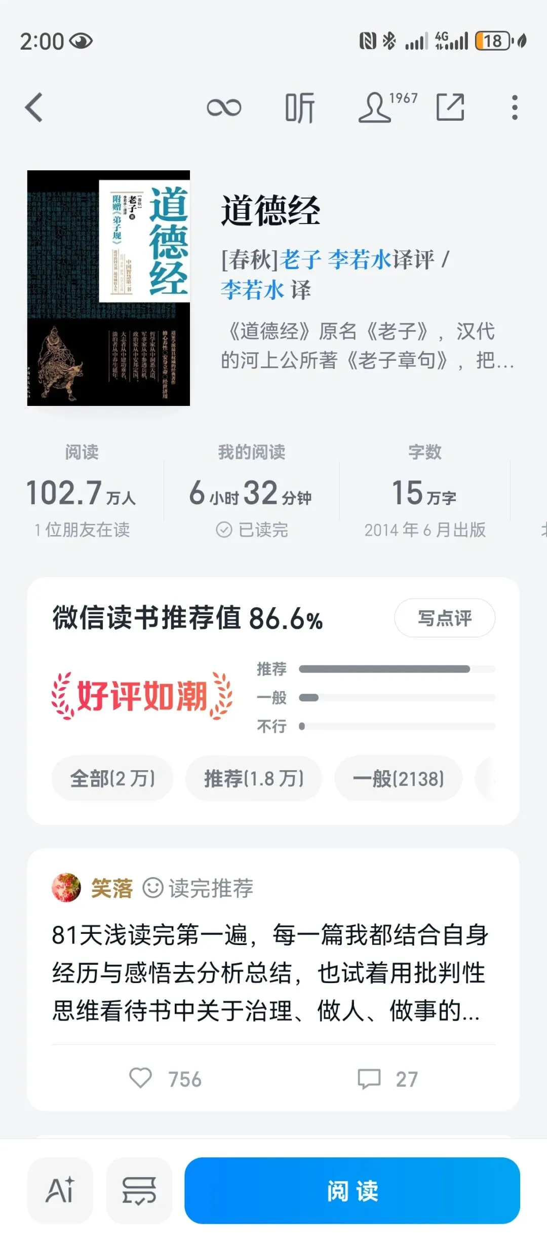 说来也巧,第一次通读《道德经》,同样是在高中。那段时间我比较容易内耗,记不清是为了寻找解脱的办法,还是别的什么原因,总之阴差阳错地就读起来了。那时对版本没什么讲究,随便从微信读书上找了一个就开始看。