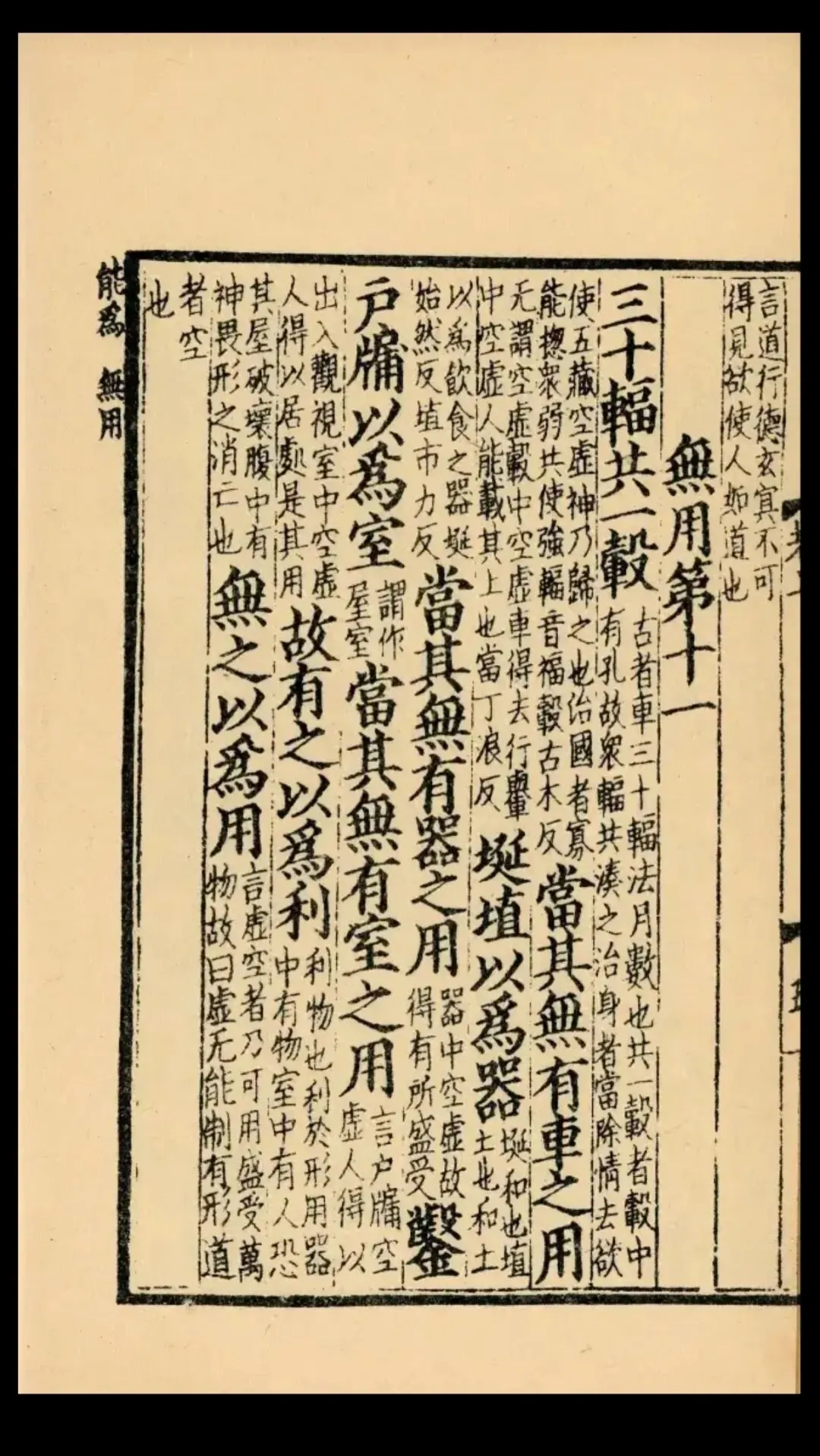 三十辐共一毂,当其无,有车之用;埏埴以为器,当其无,有器之用;凿户牖以为室,当其无,有室之用。故有之以为利,无之以为用。(第十一章)