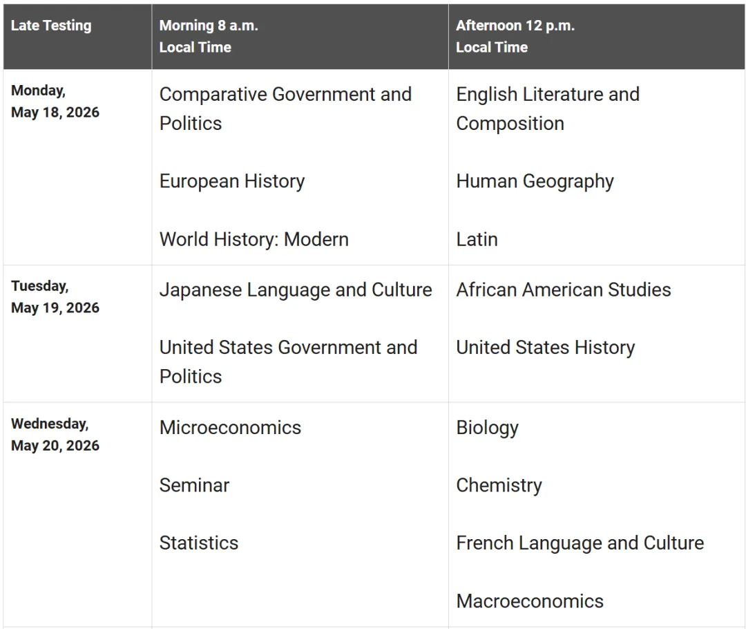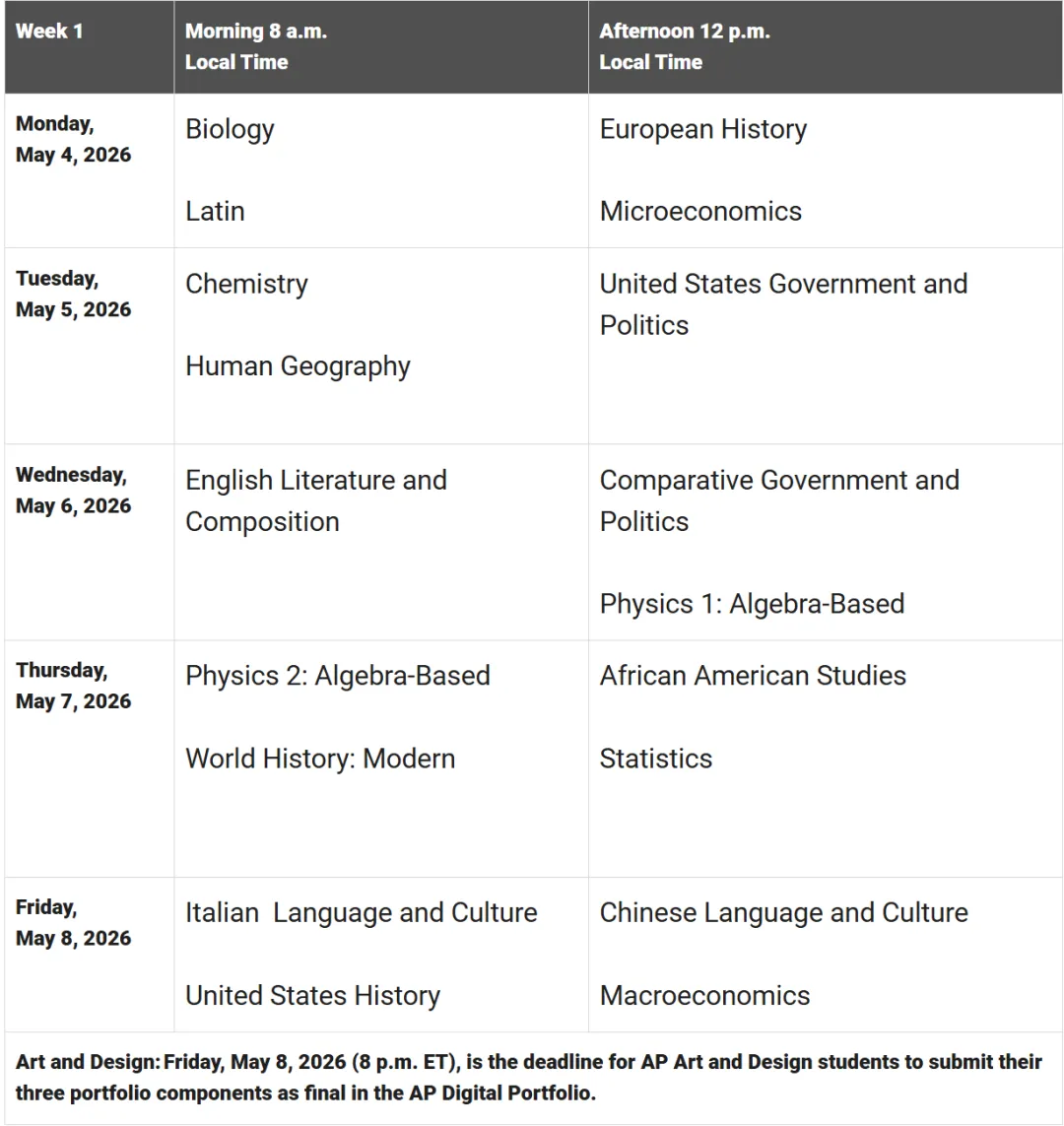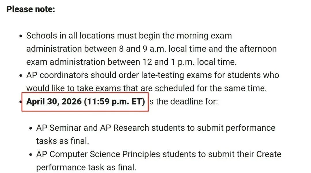 📢另外需要提醒参加AP Seminar、AP Research以及AP CSP的考生们,提交作品的截止日期为美东时间2026年4月30日23:59。