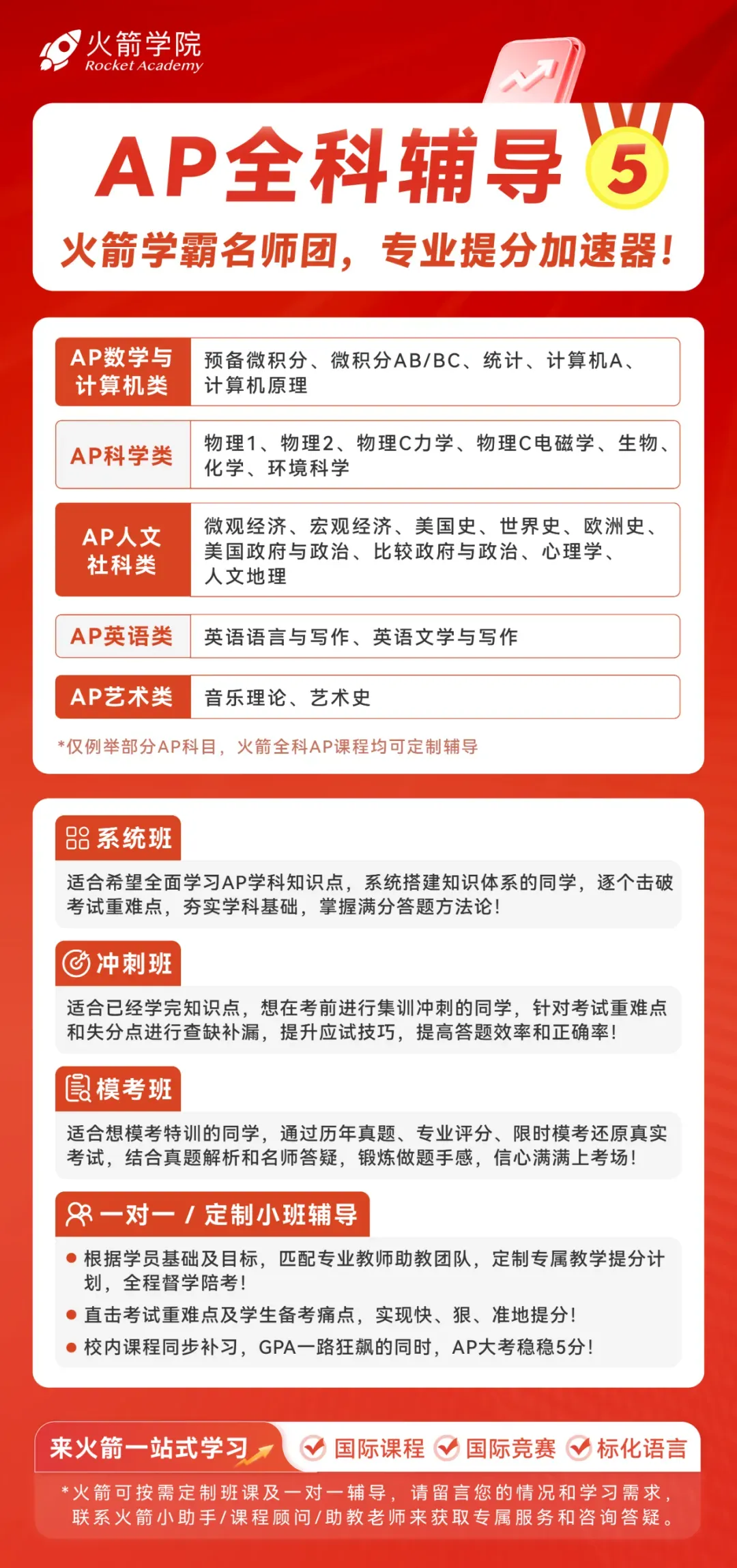 火箭老师人均教龄7年+,会紧贴CB最新AP考纲,以最高效的方式带大家全面梳理考试重难点、系统刷题,掌握答题满分方法论,实现大考5分!