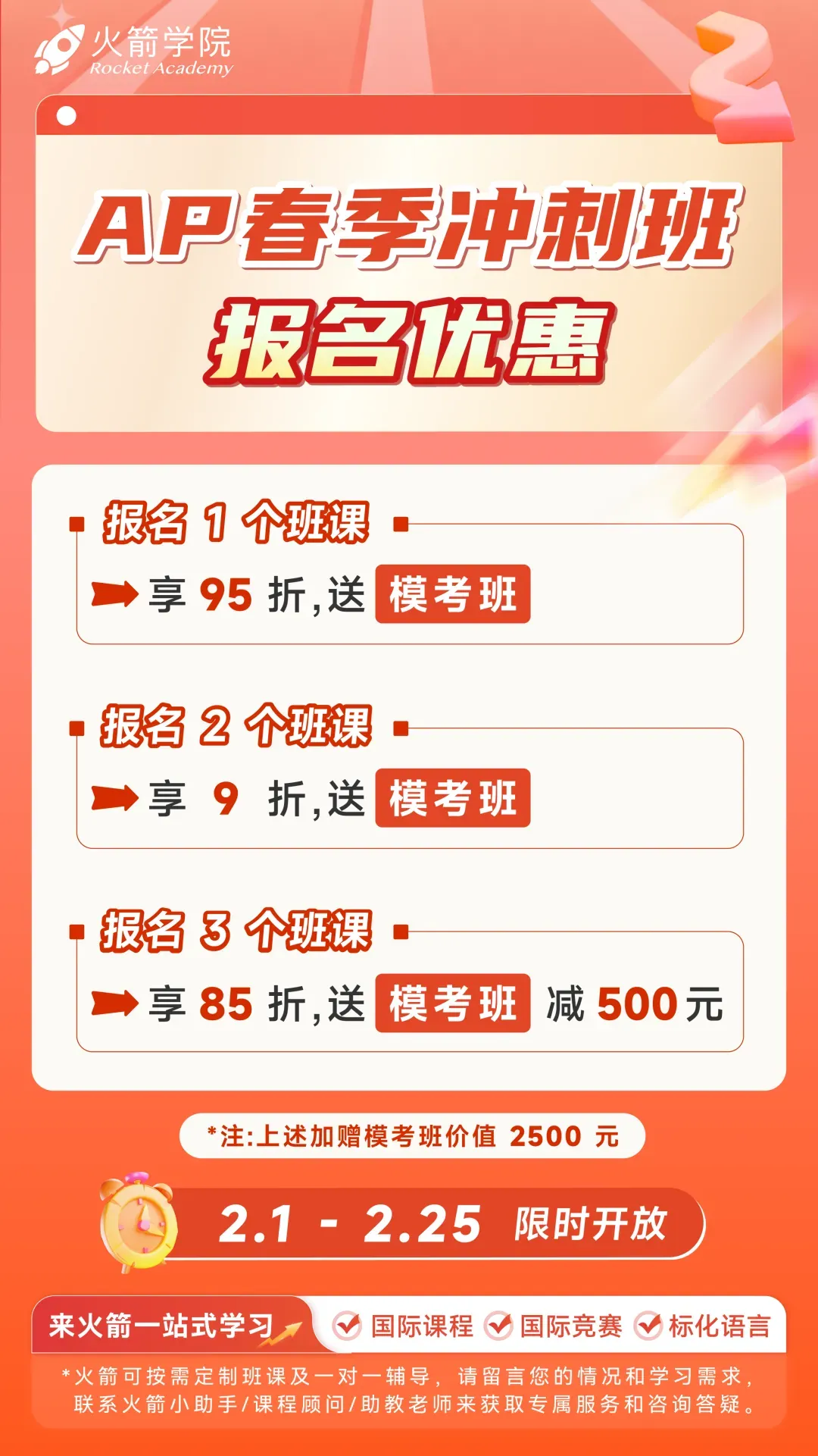 2月1号 - 2月25号,报名任意科目AP春季冲刺班,即享85折-95折优惠,再加赠价值2500元的考前模考班、现金减免。报名越多、优惠越多~