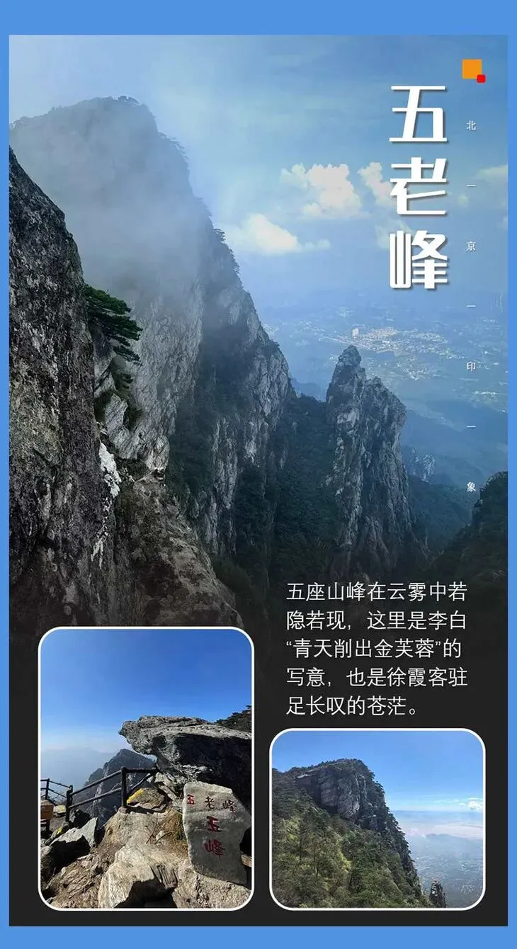 五老峰由并列的五个山峰组成,仰望俨若席地而坐的五位老翁。五个山峰各具特色,一峰到五峰景色各异,攀爬过程中可以欣赏到奇松、怪石、云海等景观。
