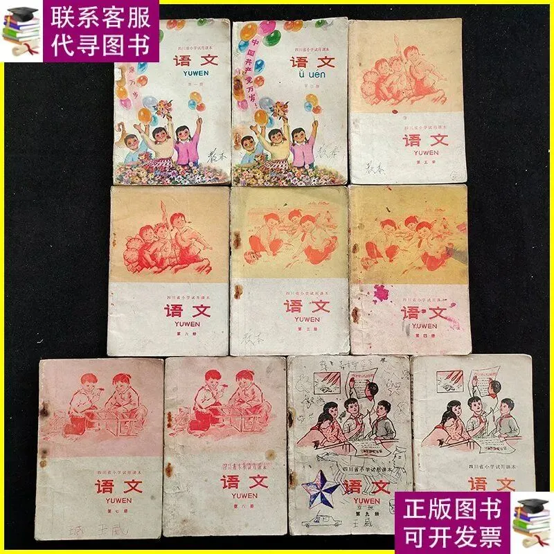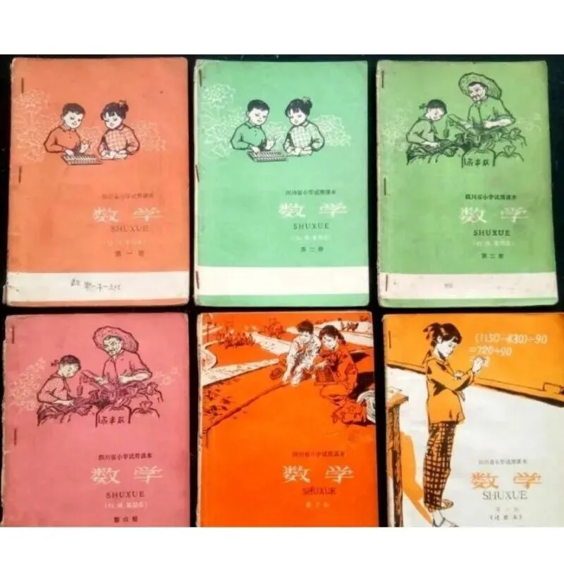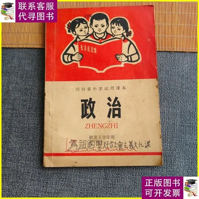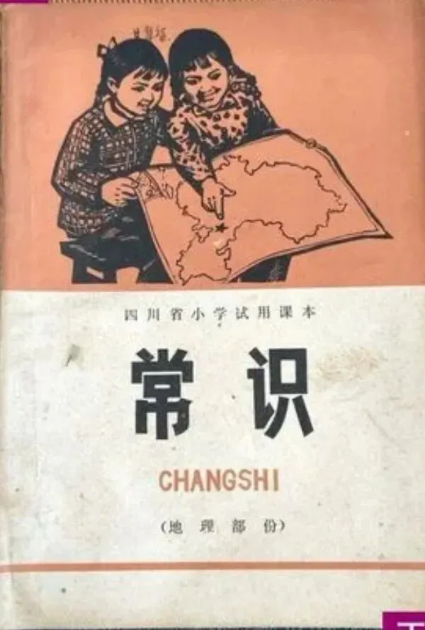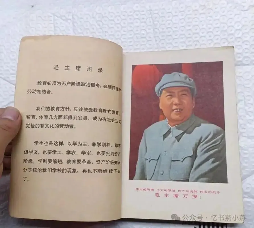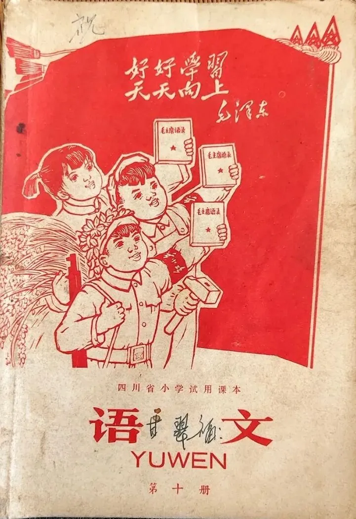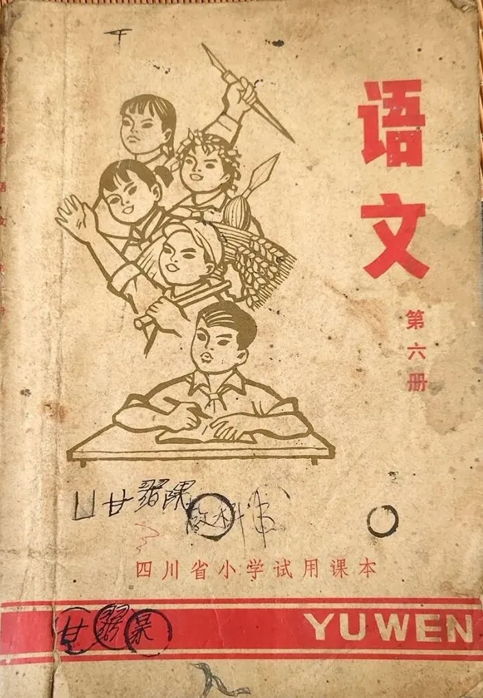 那黄色不是正黄,是那种晒透了的麦秸秆的颜色,温温的,软软的。封面上画着几个孩子,最前面的孩子手握钢笔,坐在课桌前,眼望前方,若有所思,后边站着一个男生和三个女生分别扛着铁锤,抱着麦穗,握着红樱枪、举起一支笔。挺胸昂首望着前方,这本试用教材,展示时了那个年代的特点,千万不要忘记阶级斗争,从小立下革命志,长大要当工农兵。孩子们好像总是盯着前方,将知识化为投枪匕首,随时防着帝修反和资本主义糖衣炮弹进攻。 我捧着书坐在箱盖上,一时间竟有些恍惚。
