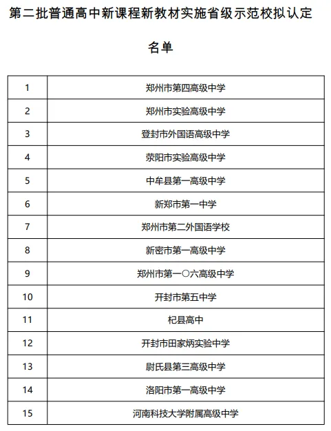 日前,省教育厅公示我省第二批普通高中新课程新教材实施省级示范校评审结果名单,拟认定郑州市第四高级中学等128所学校为第二批普通高中新课程新教材实施省级示范校。