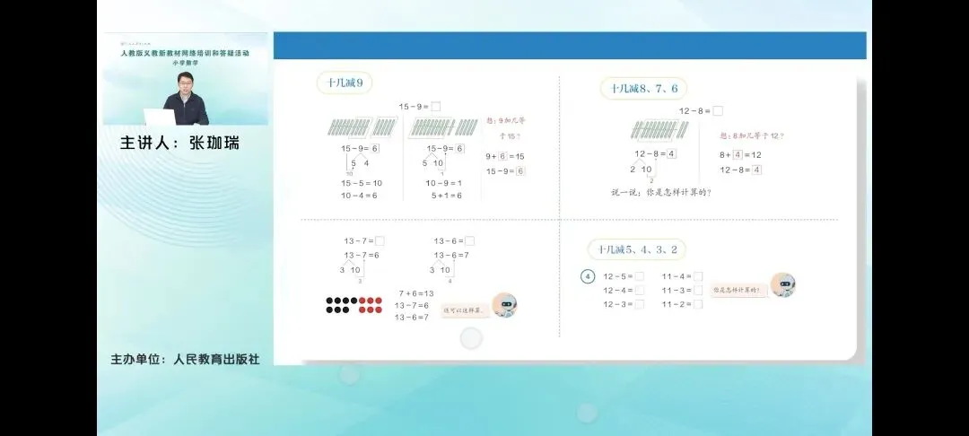 。我们先来整体看一下计算力题的编排情况。教材仍然注意体现出编排的层次性,十几减9和10几减876都属于减数比五大的情形。主要是引导学生自主探索退位减法的计算方法,并逐步提升对算力和算法的认识,逐步实现算法优化。我们也可以看到在实际减九中呈现的三种不同的计算方法,而在随着十几减876的教学,呈现的计算方法逐步的减少,而计算的过程也逐步的简洁,到了十级减5432这种减数不超过五的情况时,就鼓励学生迁移前面的学习基础,自己选择喜欢的方法进行计算,达到一个巩固练习提高的过程。
