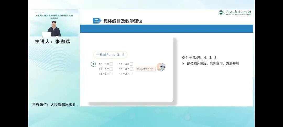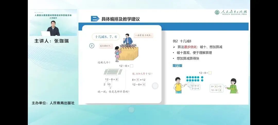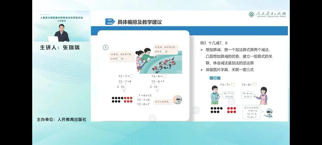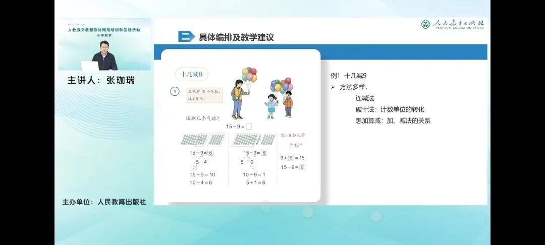 那么具体来看一下,例一教学实际减9,这是学生自主探索推位减法计算方法的环节。教材也配合呈现了多样的计算方法,包括廉减法、破使法和想加算减3种方法,引导学生自主探索,积累学习经验。其中联检法和破使法都体现了技术单位的转化过程,这也是进行退位减法计算时涉及的核心原理,就是当小单位不够减的时候,要把大单位转化为小单位再减。而想加算减则是通过直接想算式中的未知加数来进行计算的。相较而言,它的计算步骤只有一步,计算速度更快,但是它的抽象程度也更高。在这里重点是体现加减法之间的关系。那么教材在整体的呈现形式上和进位加法也是类似的。在呈现多样化的计算方法的同时,教材也重视借助多元表征帮助学生理解各种方法背后的道理。