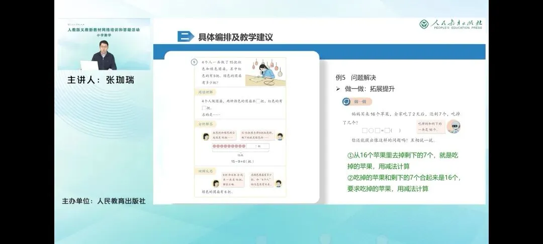 而例五中的问题情境略有不同,描述的是已知总体和其中一部分数量求另一部分数量的静态情形,这是减法模型的本质体现。但是相对来讲更为抽象。要让学生明白使用减法解决问题的道理,就需要让学生将问题中的数量关系翻译成之前学过的动态去掉的情形。那么教材在分析解答中借助圆片图让学生直观的看到,可以把十物把团扇的整体分成了两部分,要求绿色团扇的部分就要从十五把团扇的整体中去掉九把红色团扇的部分,剩下的就是绿色团扇的数量,从而理解用减法解决的道理,化新枝为旧之。此外,例五的问题中还包含了多余的条件,四个人一起做教材呢,则在回顾反思环节让学生分析这条条件的作用,帮助学生进一步理解条件和问题的关联性。增强选择有效信息来解决问题的意识和能力。