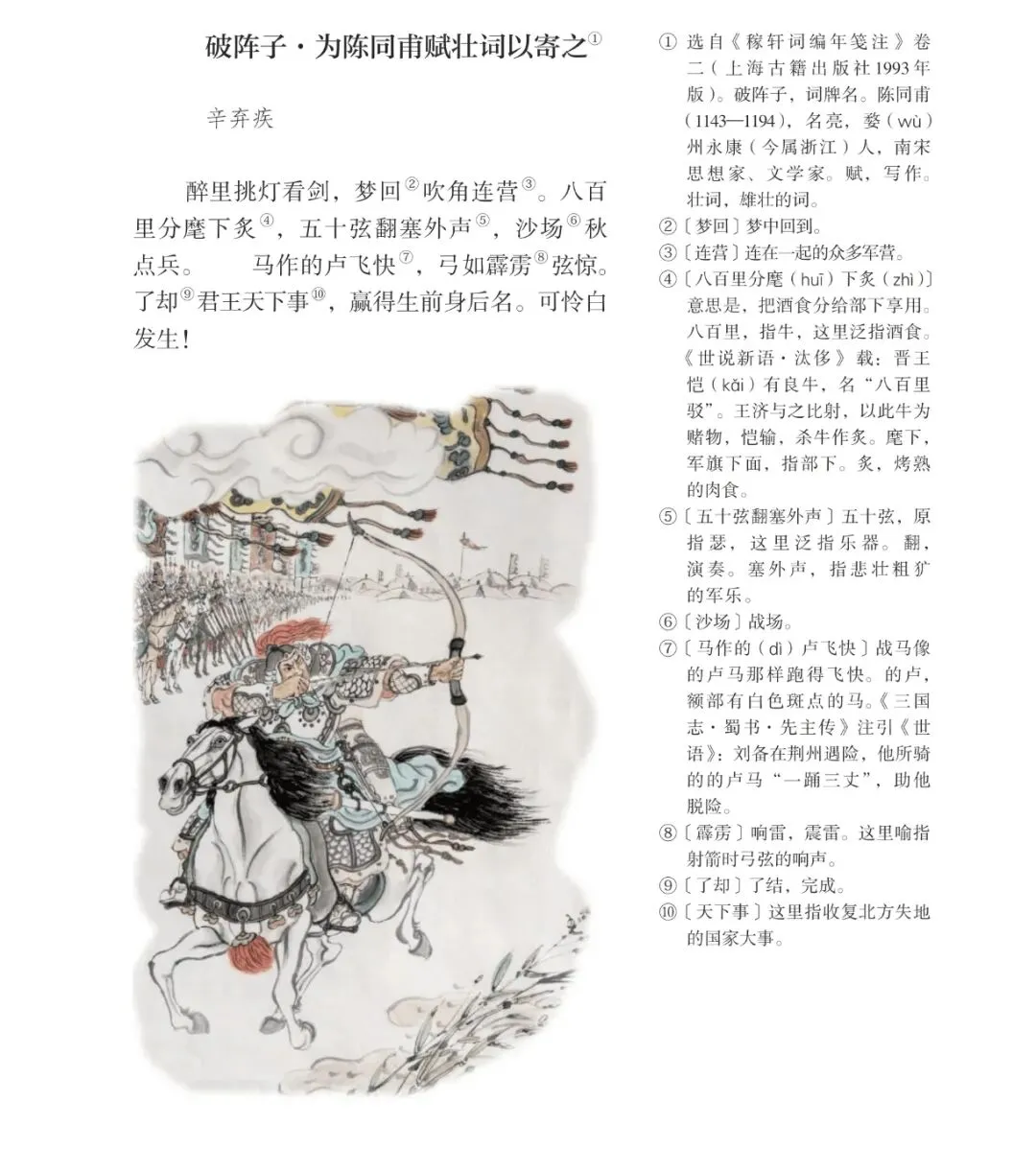 辛弃疾词中“马作的卢飞快,弓如霹雳弦惊”,以的卢马的典故,描绘了梦中驰骋沙场的壮烈场景。