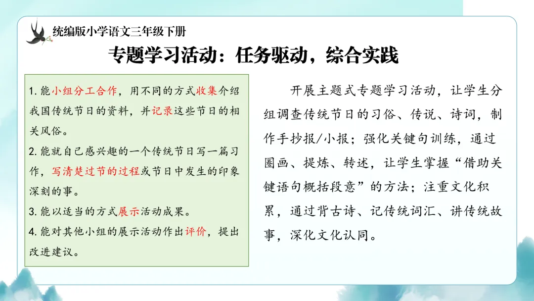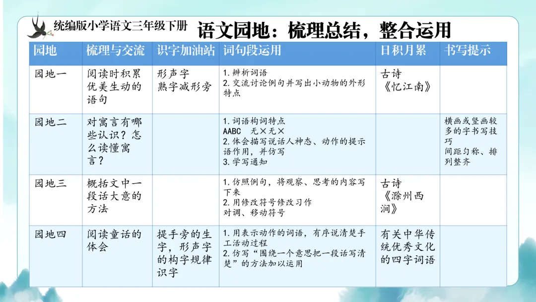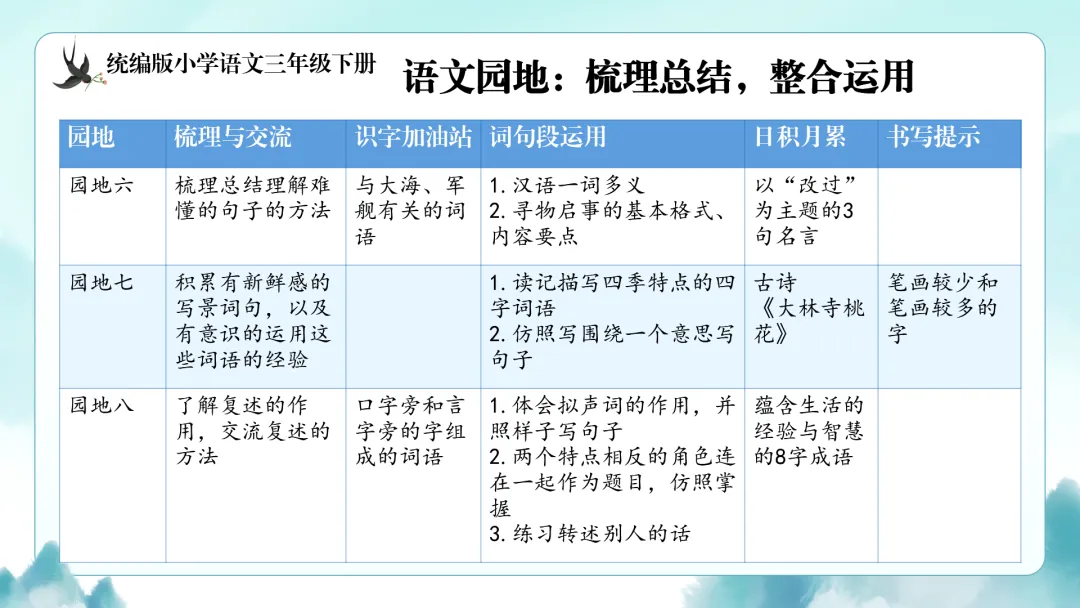 作为单元的总结和拓展,通过“梳理与交流”“词句段运用”等栏目,帮助学生梳理方法,积累语言,提升综合运用能力。