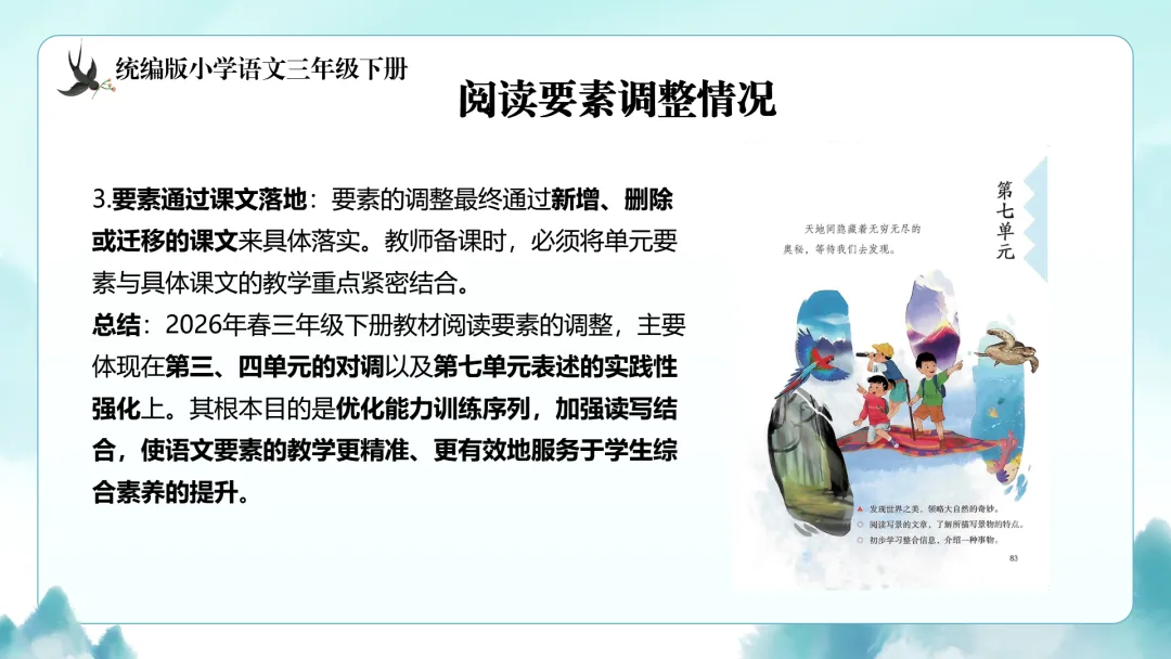 总而言之,2026春统编版三年级下册语文新教材是一套守正创新、务实高效的教材。希望这份解读能帮助大家更好地理解教材、使用教材,在新学期里,与孩子们一同在语文的世界里畅快遨游!