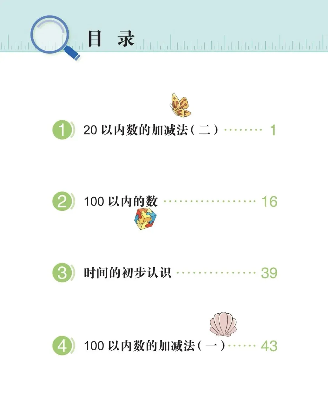 ①20 以内退位减法、100 以内数的认识与加减(进退位)