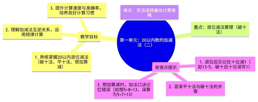 🔺 重点:退位减法的算理理解(特别是破十法)。