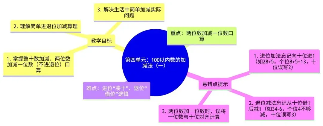核心内容:整十数加减、两位数加减一位数(不进位 / 不退位、进位 / 退位)、简单连加连减