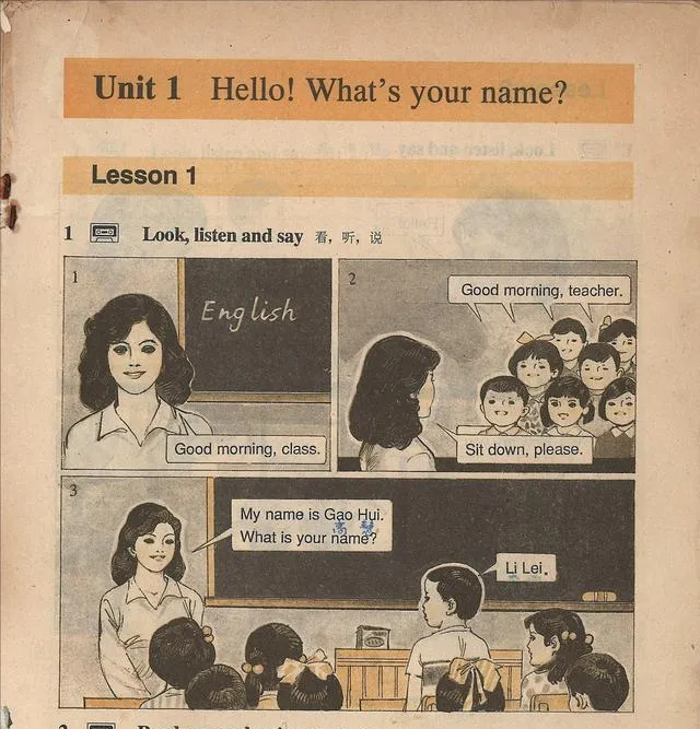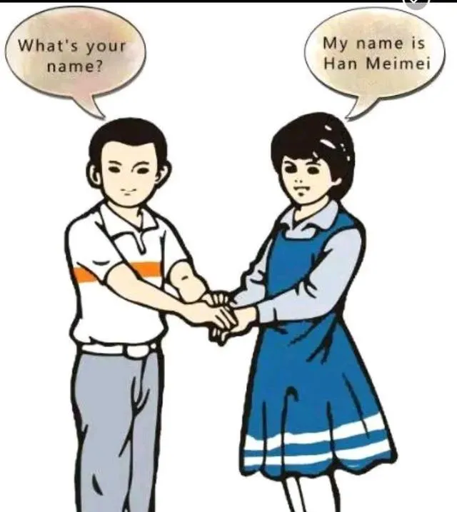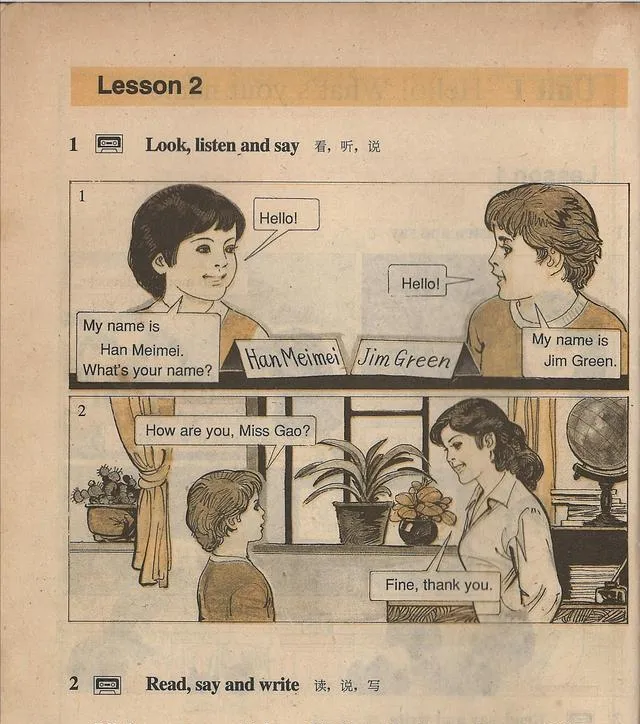 这个插画里两个孩子在握手,图中的男孩叫Li Lei,女孩叫Han Meimei,对话框里一句“What’s your name”,一句“My name is Han Meimei”,笔画朴素,线条干净,手一搭上去就像回到第一次敢开口的那天,嗓子眼有点紧,还是照着读出来了,老师在讲台边点点头,心里那口气这才落地。