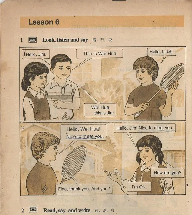 这一页排成三格,Wei Hua和Jim拿着球拍,说“Nice to meet you”,看着就知道是那堂听力后的跟读,磁带哧溜一转,男声女声一前一后,我们跟着念到嗓子哑,桌斗里铅笔和橡皮撞在一起吱啦响,班里最会读的同学拖着长音,**“Fine, thank you, and you”**那句拖得老长,窗外叫卖烧饼的嗓门远远飘过来,谁也不敢分神。