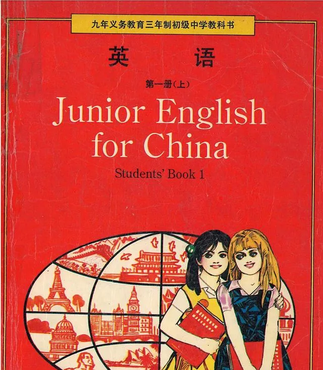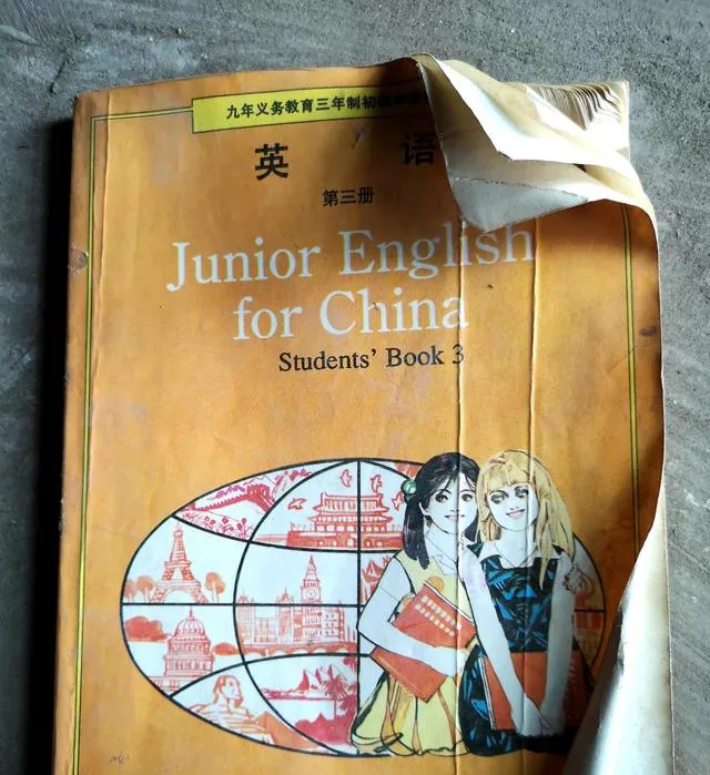 图中这三本封面颜色一橙一绿一红,英文写着Junior English for China,左下角一个大大的椭圆地球窗,切成几格,把埃菲尔铁塔和天安门都画进去了,纸壳有点起毛,翻多了的地方折痕发白,书脊上用透明胶缠过一圈又一圈,像给它打了夹板,拿在手里沉甸甸,那个年代的教科书就是这样实在。