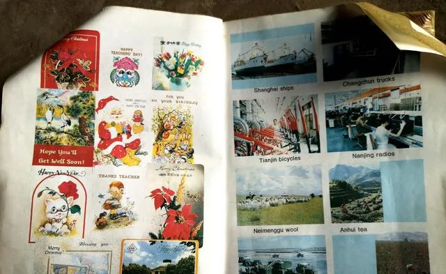 图中这一页贴满了彩色小画,礼物卡片、邮票、工厂车间和Nanjing radios一排排,颜色有点退,可词还是那几个词,上海的船,长春的卡车,天津的自行车,各地名物搭配英文名,像给我们补地理常识,老师笑说这页不用死记,看图会猜就是本事,同桌小声嘀咕,猜对也得靠运气。