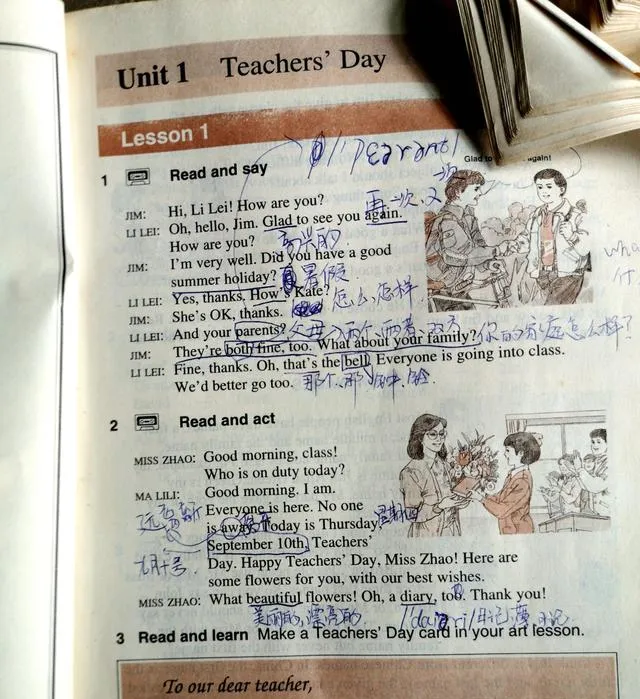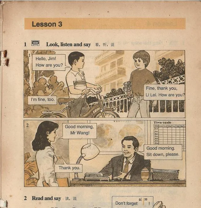 Lesson 3里Li Lei推着自行车,护栏后是一片树影,Fine thank you那句贴在气泡里,胆子大点的同学会把声调往上扬一下,像真在街上打招呼,楼道里铃声一响,大家把书一合,“Sit down please”还在嘴边转圈,现在回看这页,连车铃的“叮铃”都在耳边。
