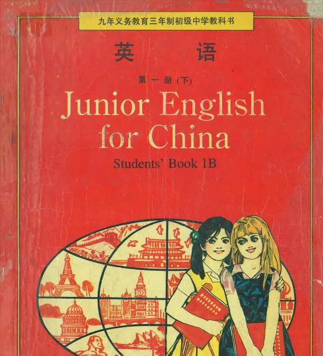 这个红皮的1B封面最扎眼,红得正经,边框一圈细金线,两个姑娘抱着书站在地球窗前,角落里有几道深划痕,是从书包里抽出来的时候被拉链蹭的,以前带它去自习室,摊开就先翻目录,看看今天要啃到哪一课,现在孩子们刷平板点开配音就学,方便是方便,可翻页那种沙沙的声音没了。