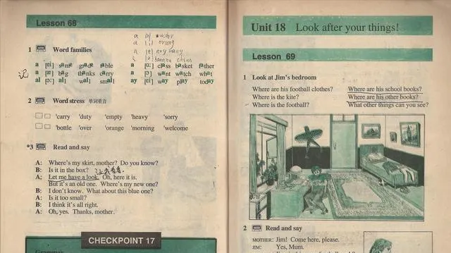 图中这页是Unit 18,绿墨印的,左栏是word families,右栏问Where is the football,One by one追着找,抽屉里,床底下,书架上,像做寻宝游戏,小时候在家也玩这一套,妈妈问,铅笔哪去了,我答,In my pencil-box,妈妈接一句,那你的pencil-box呢,我一愣,屋里转一圈,笑得前仰后合。