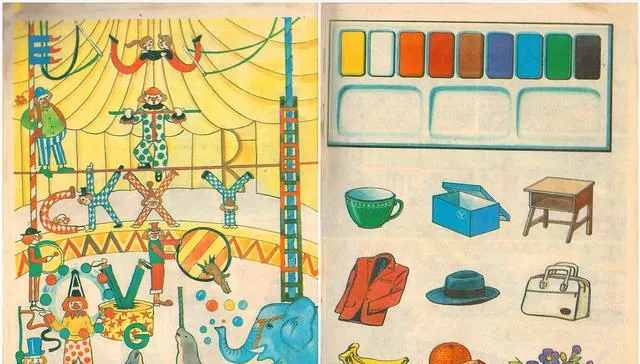 这张左右两页全是手绘,马戏棚里跳跃着A到Z,旁边摆着帽子茶杯和调色盘,颜色旧了还亮,像蜡笔按在纸上一层一层抹出来的,小时候我就盯着那顶蓝帽子,怎么都想不明白为什么叫hat而不是cap,后来老师一笑,说别抠,能张口比抠字更要紧。