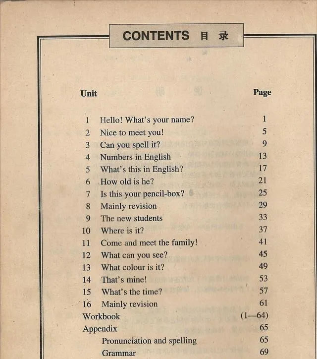 目录页很老实,Unit从1排到16,题目一句比一句简短,What colour is it,What’s the time,Checkpoint卡得清清楚楚,班里背目录是硬规定,谁被抽到就站起来背到哪儿是哪儿,紧张归紧张,背顺了心里就亮堂,后来复习翻这页找定位,快得很。