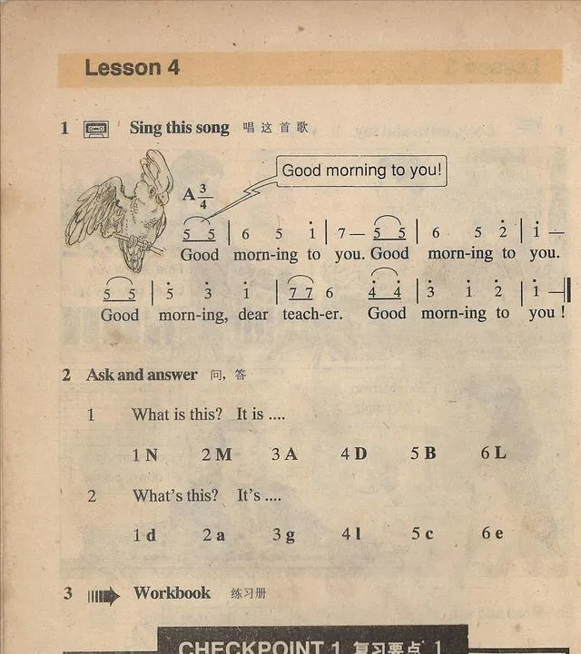 这张最俏皮,左上角一只小鹦鹉,五线谱上写着Good morning to you,老师按下磁带机,啪的一声,音乐蹦出来,我们跟着唱得乱七八糟,合上书我还在嘴里哼,爷爷端着搪瓷缸路过,说这曲子好记,开口就不害怕,我点点头,把那句“Good morning dear teacher”又哼了一遍。